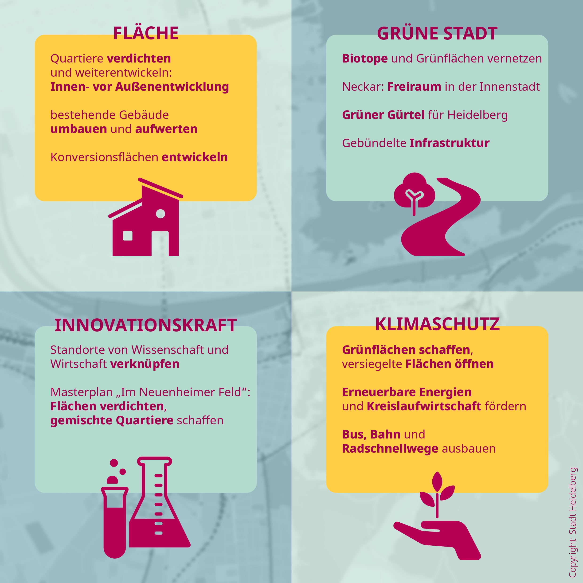 Bezahlbarer Wohnraum, sparsamer Umgang mit Flächen und Raum für Innovationen zählen zu den großen städtebaulichen Herausforderungen. Durch eine vorausschauende und effiziente Stadtplanung will die Stadt heute die Voraussetzungen dafür schaffen, dass Heidelberg auch morgen lebenswert, nachhaltig und zukunftsfähig bleibt.