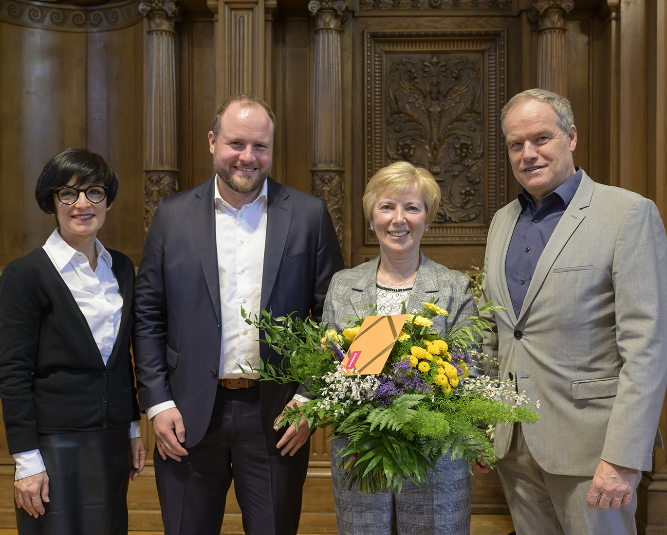 Vier Menschen mit Blumenstrauß lächeln in die Kamera.