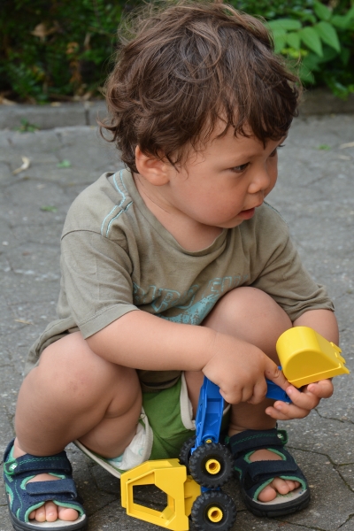 Kleines Kind sitzt in der Hocke und spielt mit einem Spielzeugbagger (Foto: Kristina Wetzel)