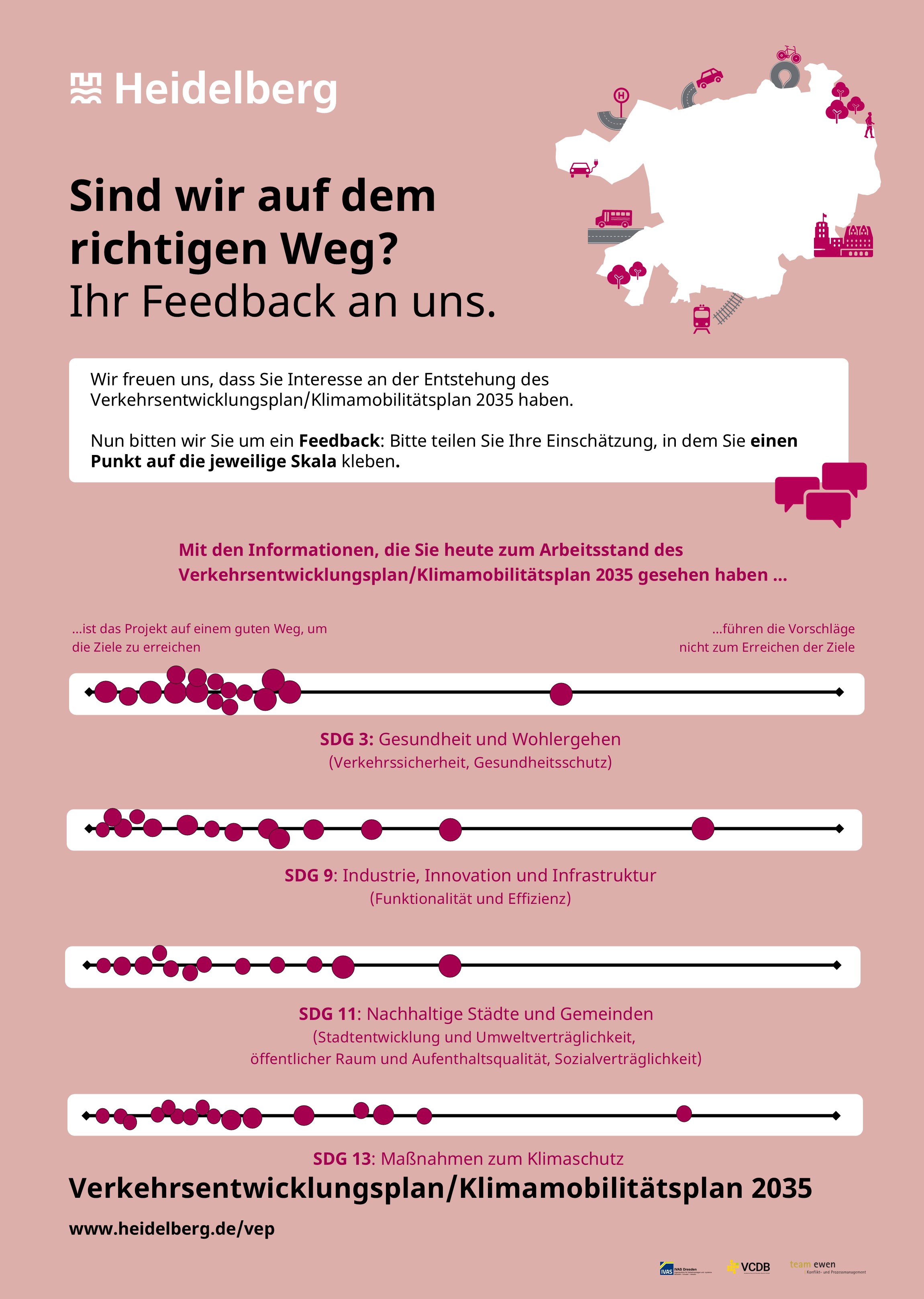 Die Rückmeldungen aus der Veranstaltung waren mehrheitlich positiv, insbesondere das vernetzte Gesamtkonzept und das Zielbild für die Mobilität in Heidelberg 2035 überzeugten die Teilnehmenden. Der Plan befindet sich nun in der finalen Ausarbeitung, damit er final vom Gemeinderat beschlossen werden kann. Ausstehend ist noch ein Umsetzungskonzept, dass die Maßnahmen zeitlich reiht und priorisiert. Hierbei wird auch die finanzielle und kapazitative Leistungsfähigkeit der Stadt berücksichtigt.