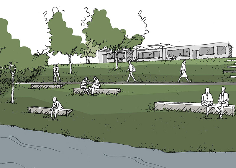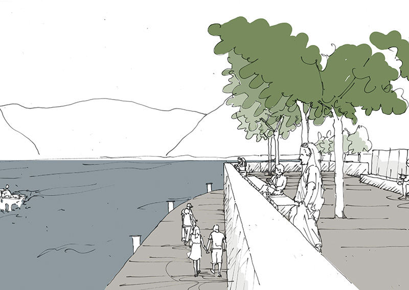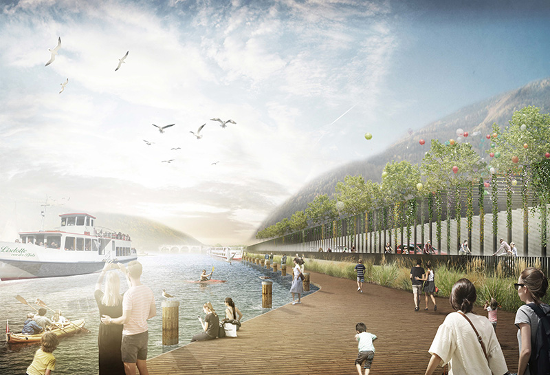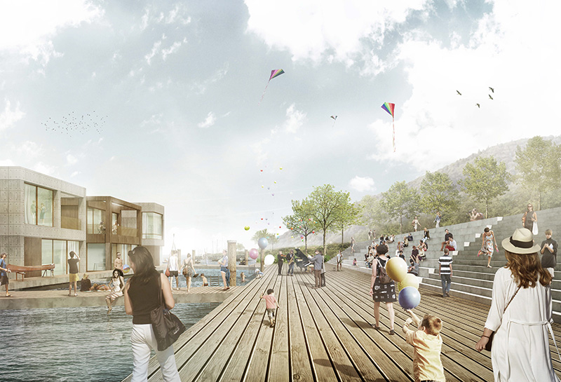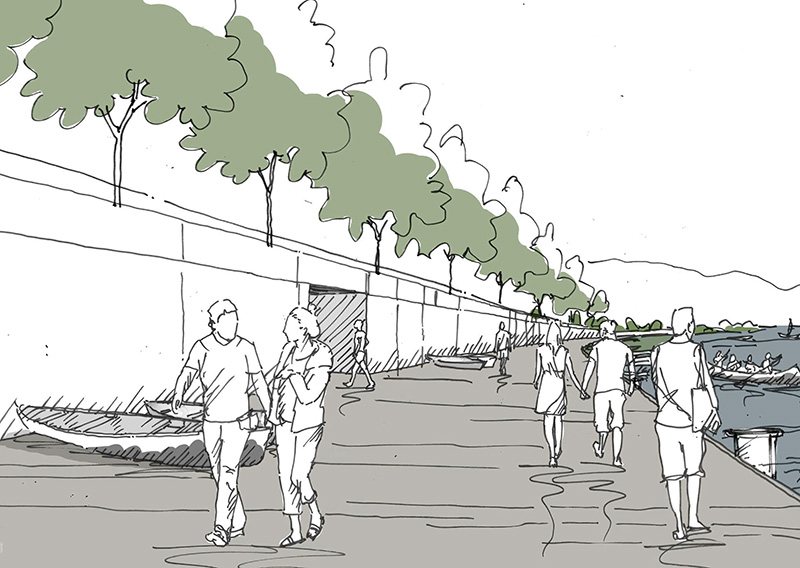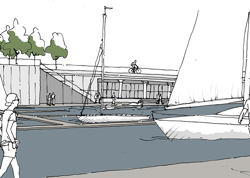 Die bereits bestehende Terrasse des Uferbereichs könnte erweitert und mit Treppen ausgestattet werden. Die grüne Böschung wird durch Baumpflanzungen ergänzt. Ein schwimmender Steg lagert sich vor der Bestandsböschung an.