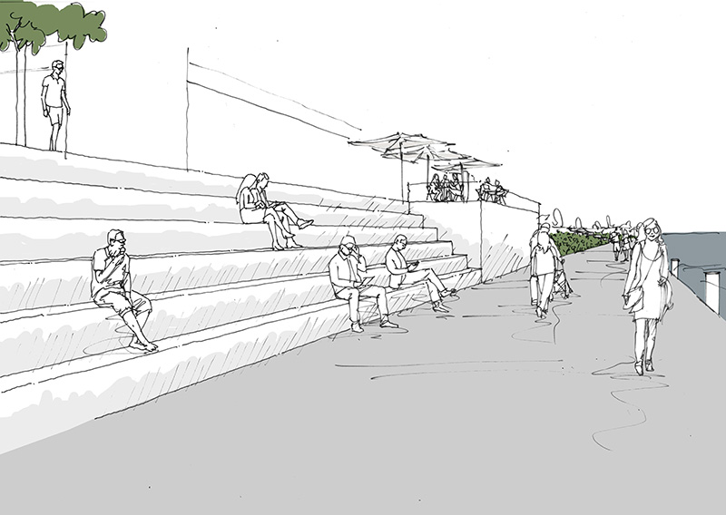 Die Fläche könnte außerdem für Verkaufsstände, Tauschbörsen, Flohmärkte oder Altstadtfeste genutzt werden. Ein neuer, zusätzlicher Zugang führt über eine Treppe von der Brückenebene aus zum neuen Freiraum.