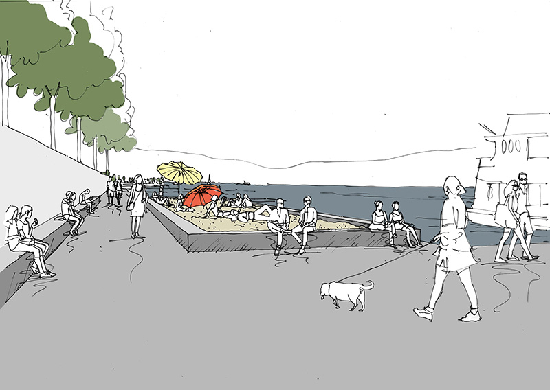 Hochwertige Sitzstufen aus rotem Sandstein bieten neue Sitzgelegenheiten. Einbauleuchten in den Sitzblöcken sorgen für eine Ausleuchtung. Als Nutzungsoption für diesen Bereich werden stabil verankerte Rahmenkonstruktionen, die den „Neckarstrand“ einfassen und schwimmende Holzdecks zur Naherholung skizziert. Die genaue Positionierung ist so gewählt, dass der Blick ungehindert auf die gegenüberliegende Uferseite Richtung Philosophenweg und Sonnenuntergang gelenkt wird.