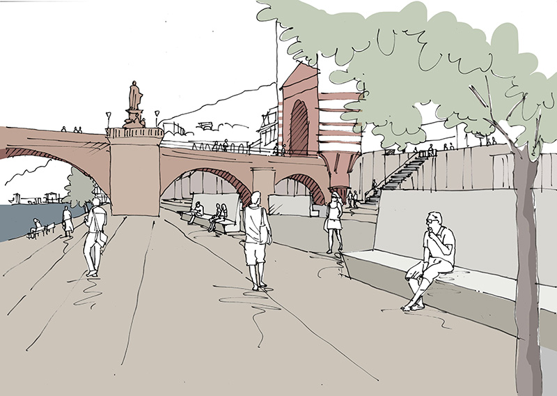 Zukünftig könnte, beginnend am östlichen Ende des Neckarlauers ein schwimmender Steg unterhalb der alten Kaimauer bis kurz vor die Alte Brücke führen. „Floating green“ breitet sich zwischen der historischen Mauer mit dem historischen Geländer und dem neuen Steg aus und sorgt für eine Begrünung des Bereichs.
