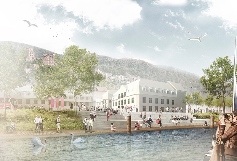 Die Gestaltungsideen aus den Bürger-Workshops mit Wünschen und Anregungen für diesen Ort sind in die Planungen der Promenade am Neckar eingeflossen. In Ufernähe sollen nur wenige, sehr behutsame Eingriffe vorgenommen werden um eine möglichst naturnahe Gestaltung mit Rücksicht auf die wertvolle Flora und Fauna in diesem Gebiet zu erreichen. Dazu könnten Sitzstufen in die Böschung integriert werden, die als Aufenthaltsort mit ansprechendem Ausblick dienen. Eine Pendelfähre könnte zum Stadtteil Neuenheim verbinden. Der Radweg wird wieder vom Fußweg getrennt an der B37 geführt. Als Nutzungsoption für diesen Bereich wird außerdem ein Infozentrum mit kleinem Café und einer Terrasse, die als Plattform für Kultur genutzt werden kann, skizziert.