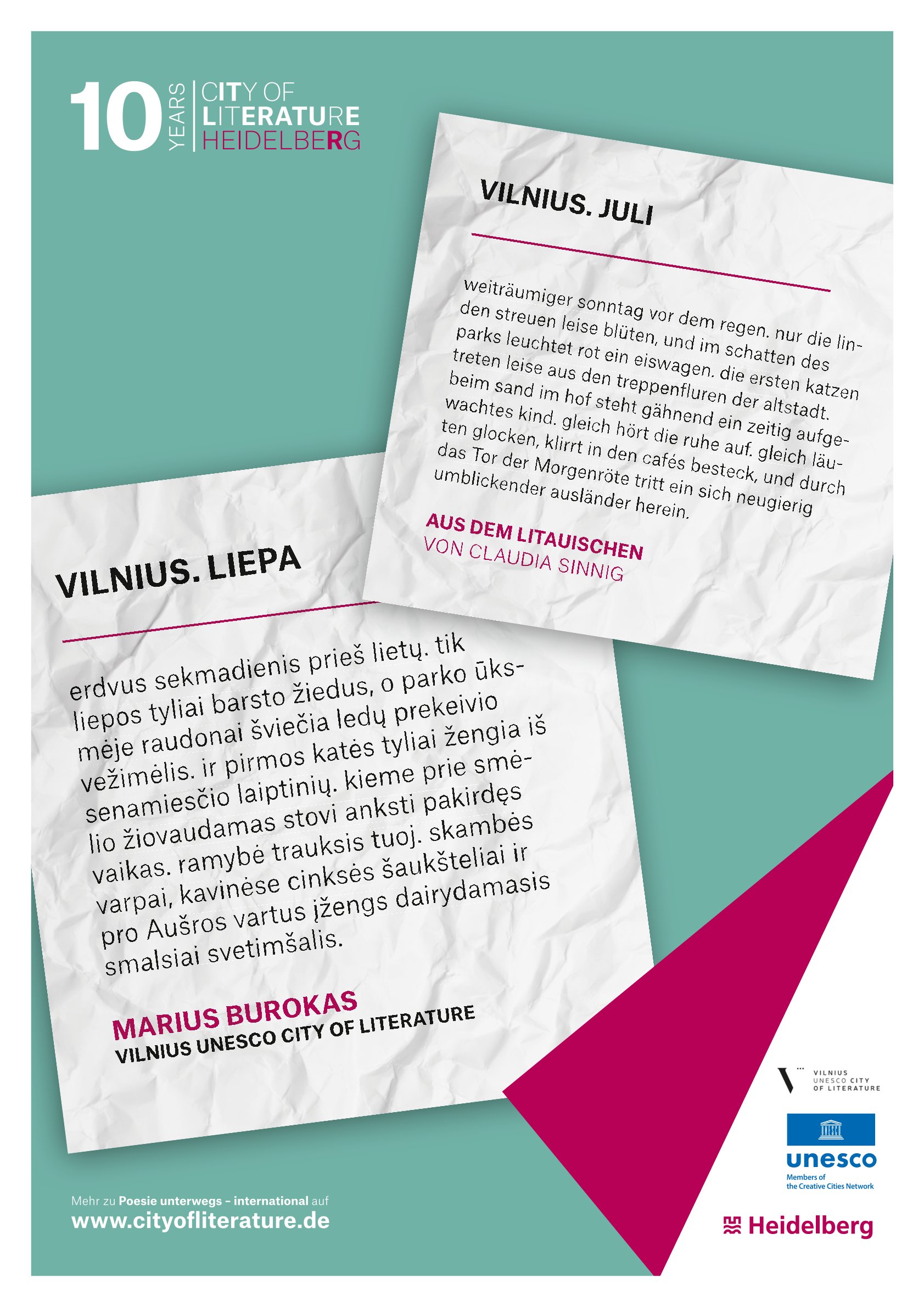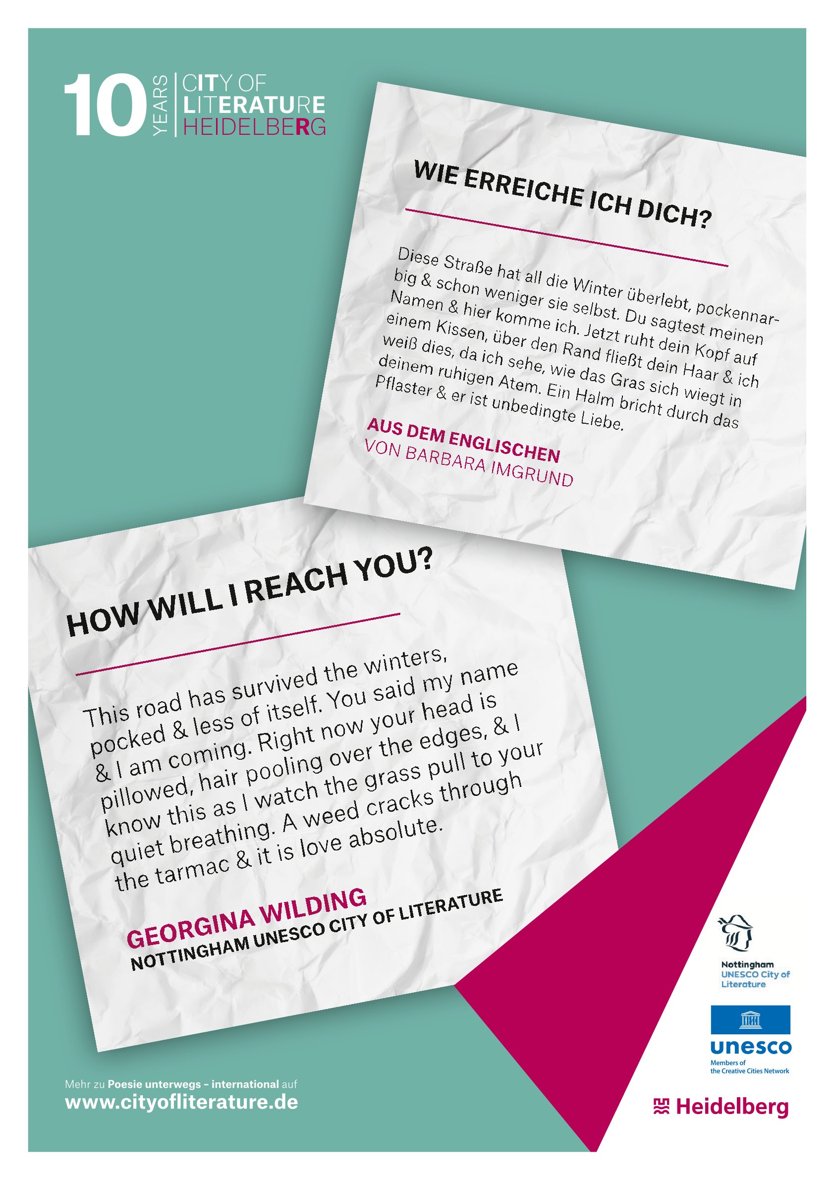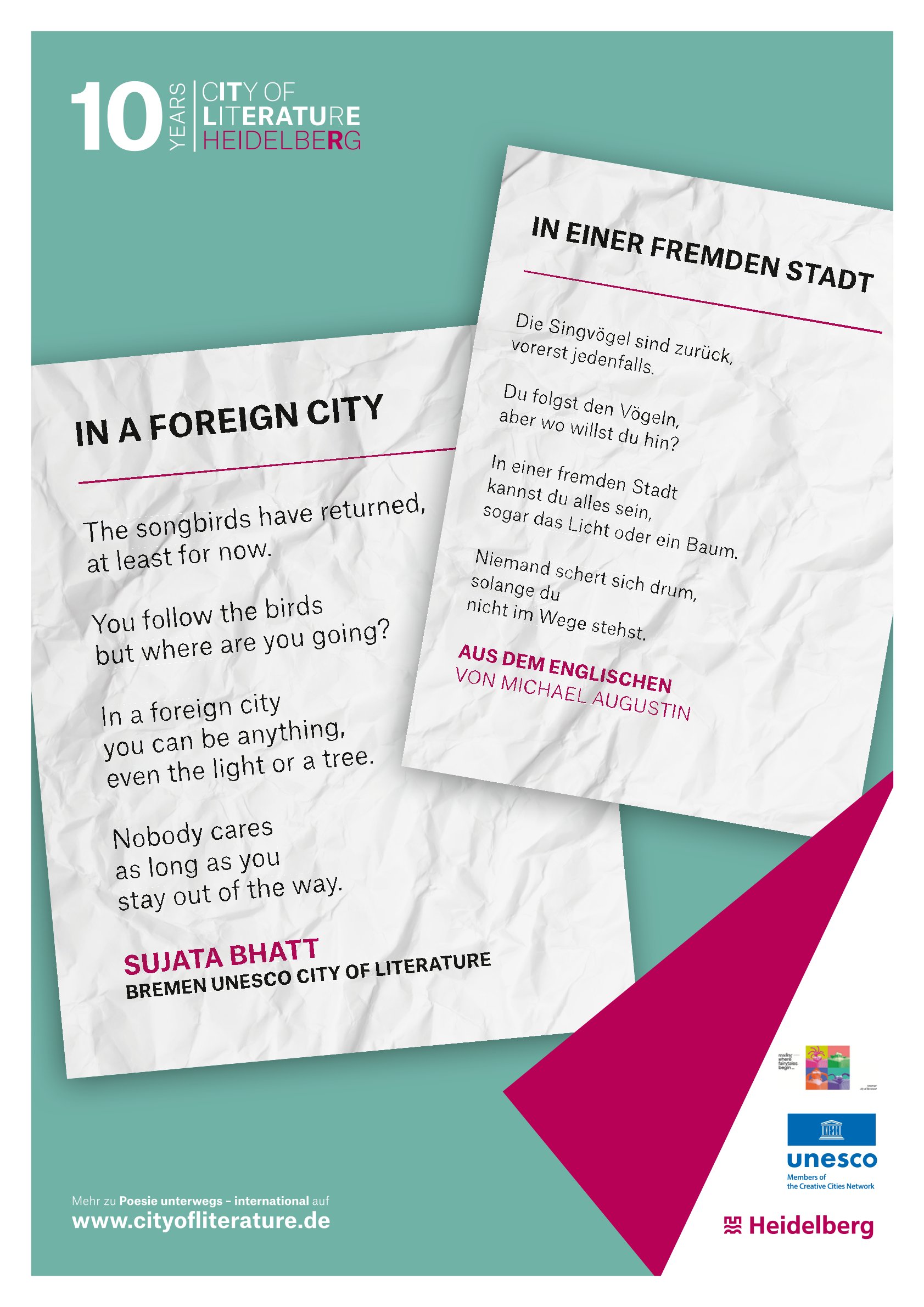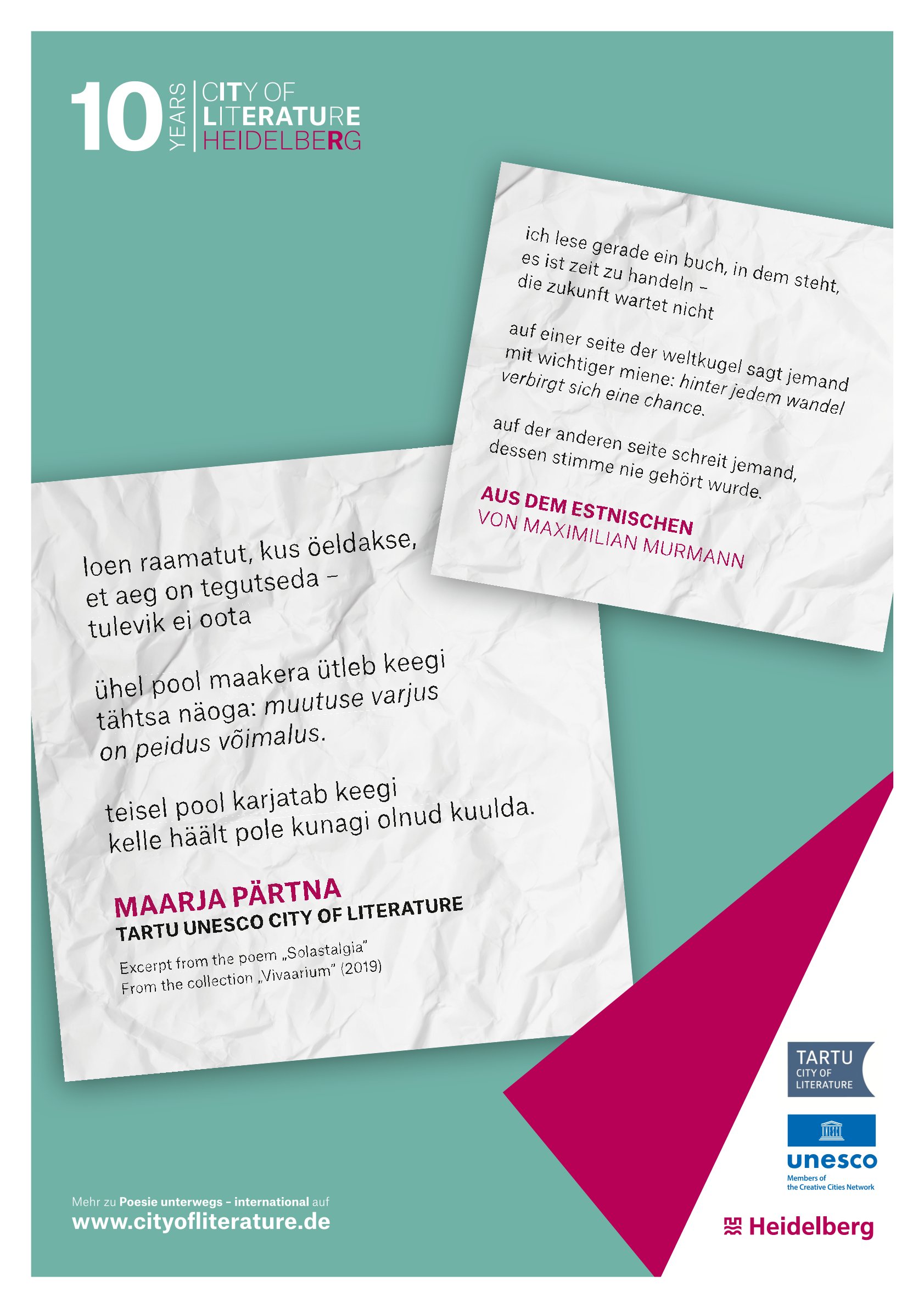 Anlässlich des 10jährigen Jubiläums der Literaturstadt Heidelberg wurde das Format „Poesie unterwegs“ als „Poetry On The Move“ erstmals in das internationale Netzwerk der UNESCO Cities of Literature eingeführt.