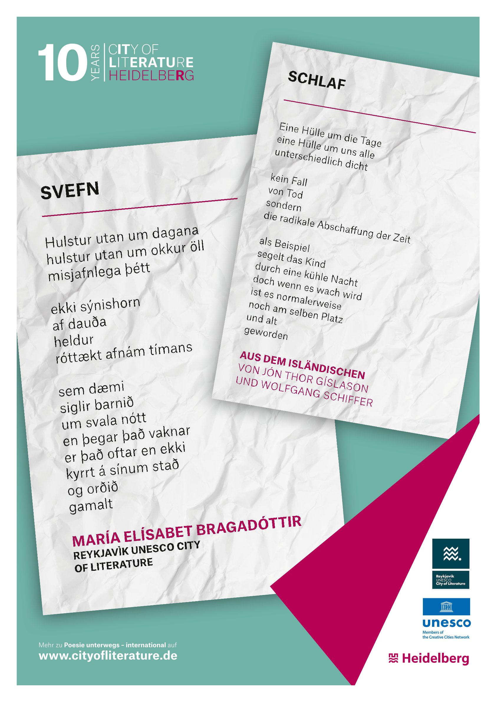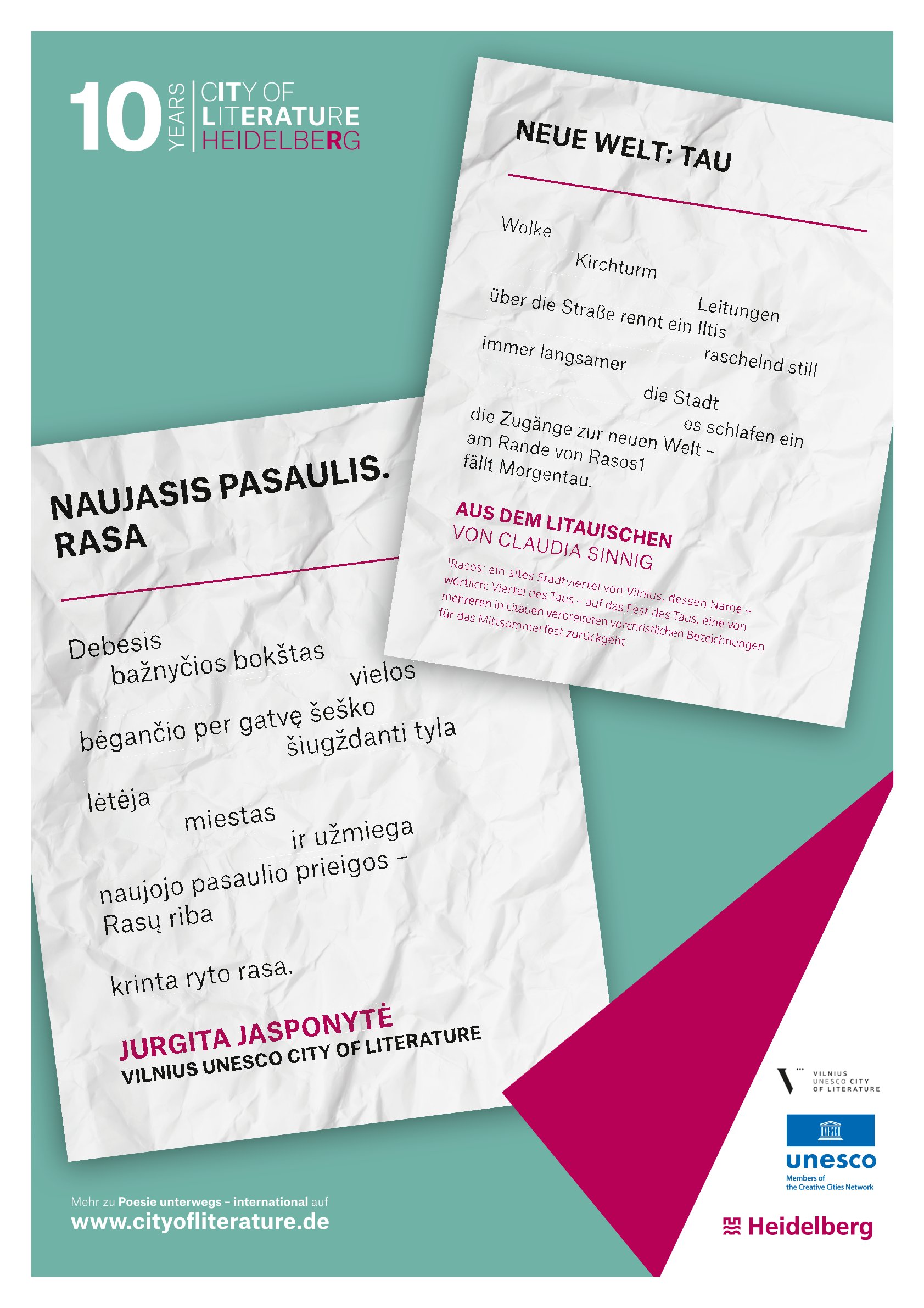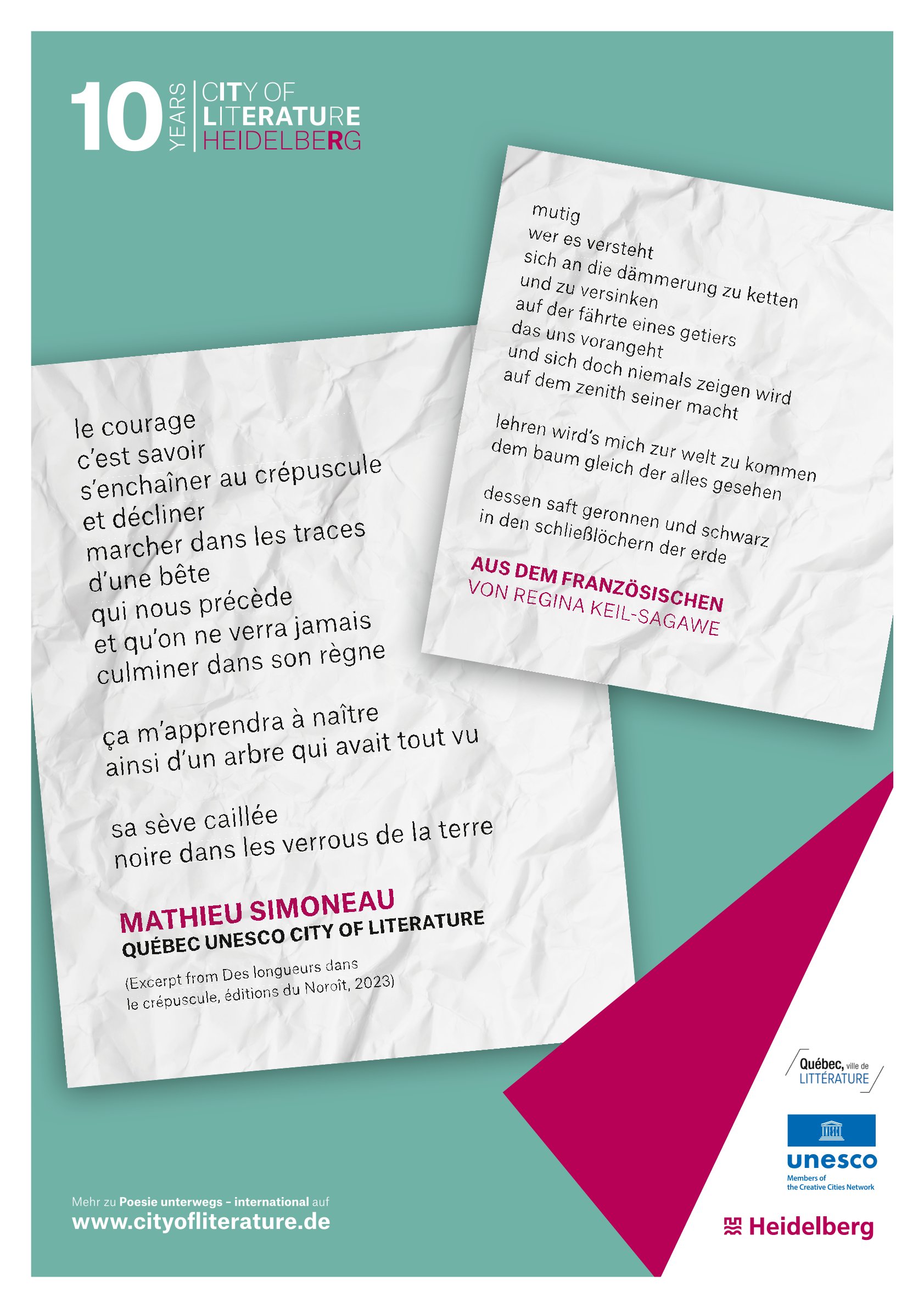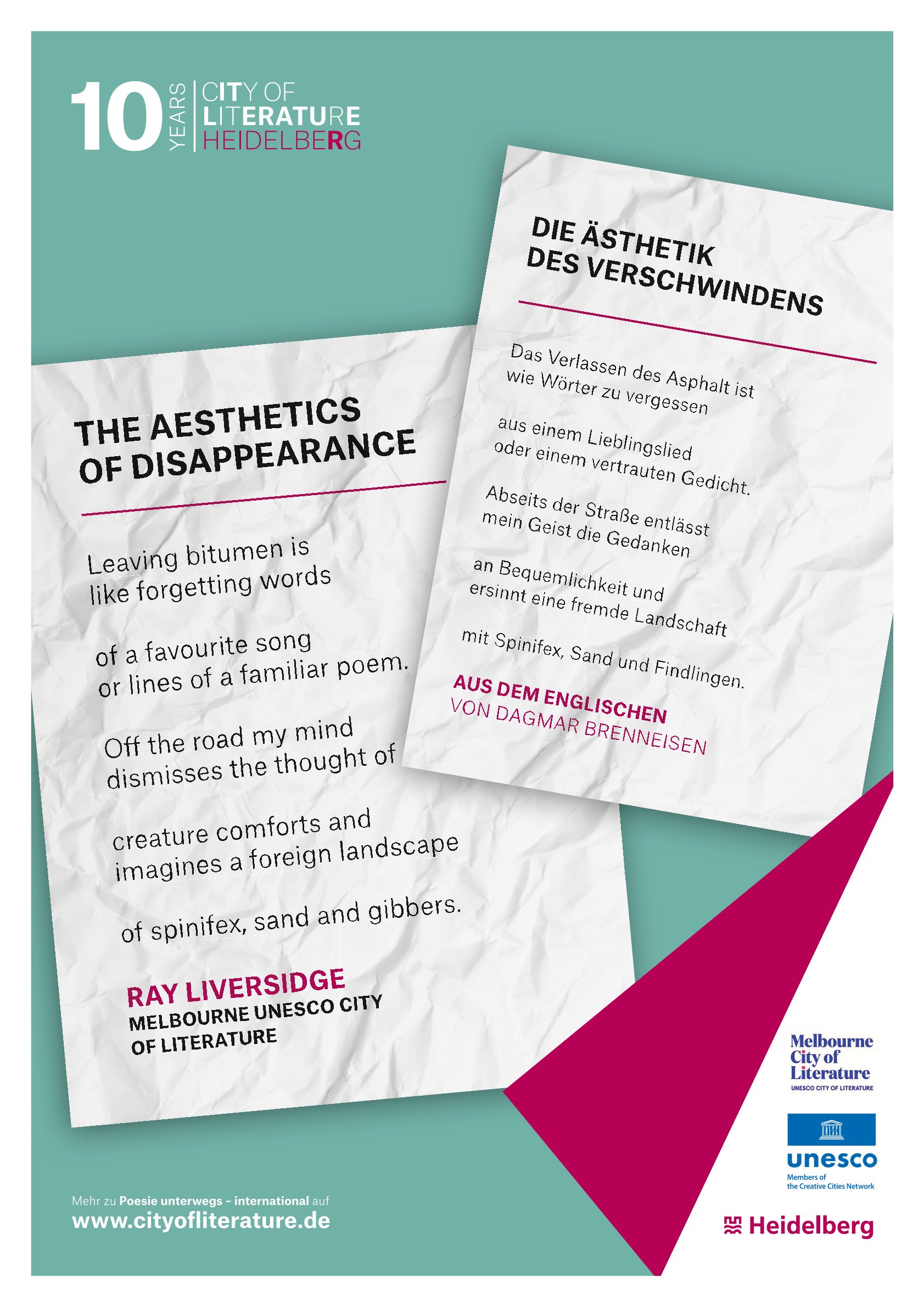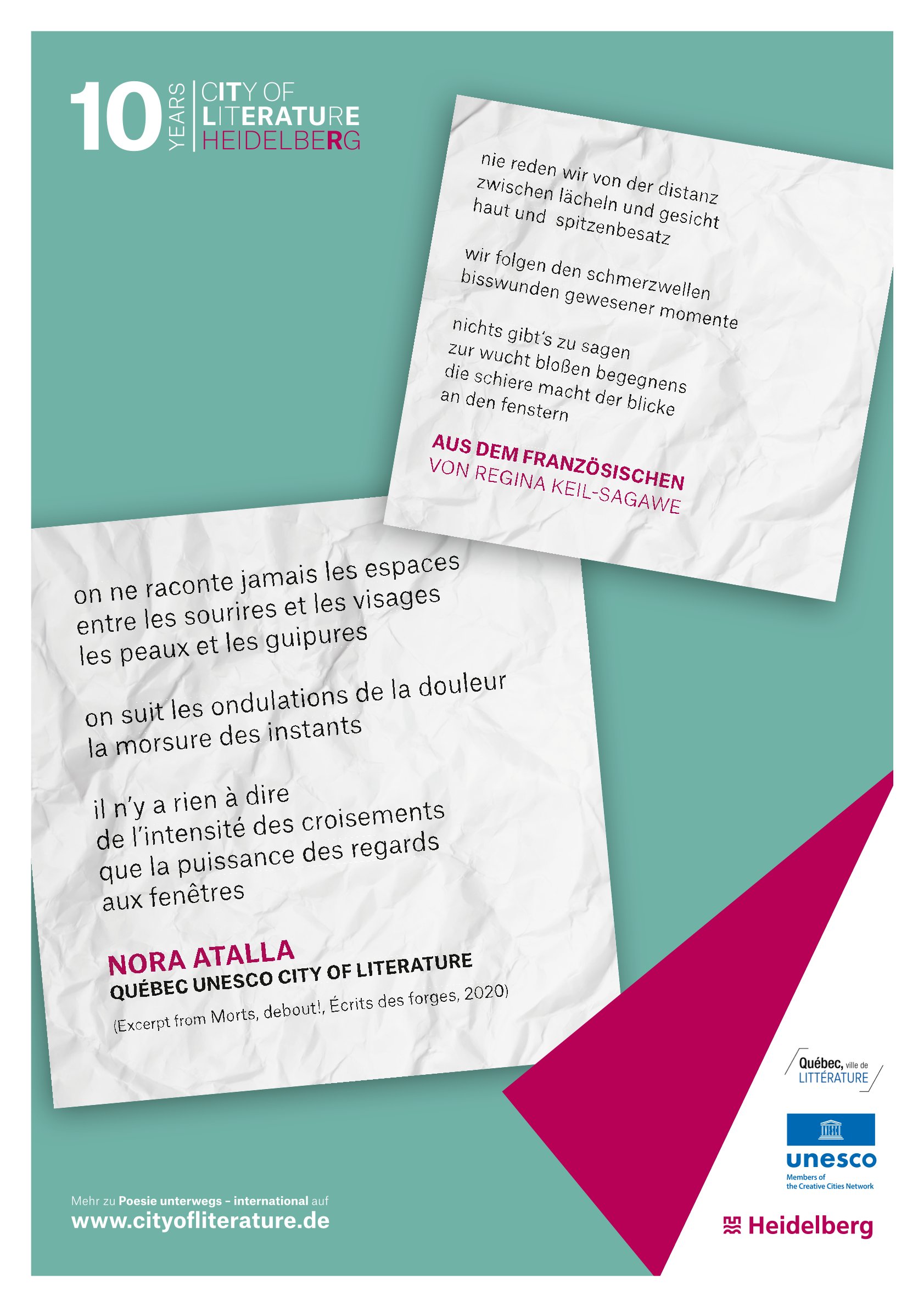 Anlässlich des 10jährigen Jubiläums der Literaturstadt Heidelberg wurde das Format „Poesie unterwegs“ als „Poetry On The Move“ erstmals in das internationale Netzwerk der UNESCO Cities of Literature eingeführt.
