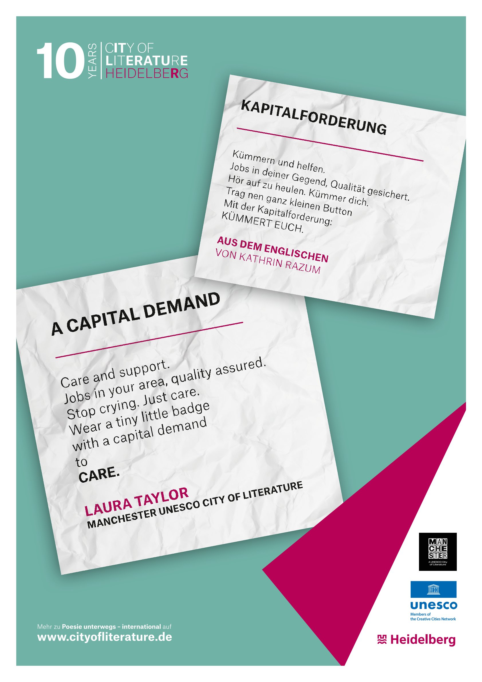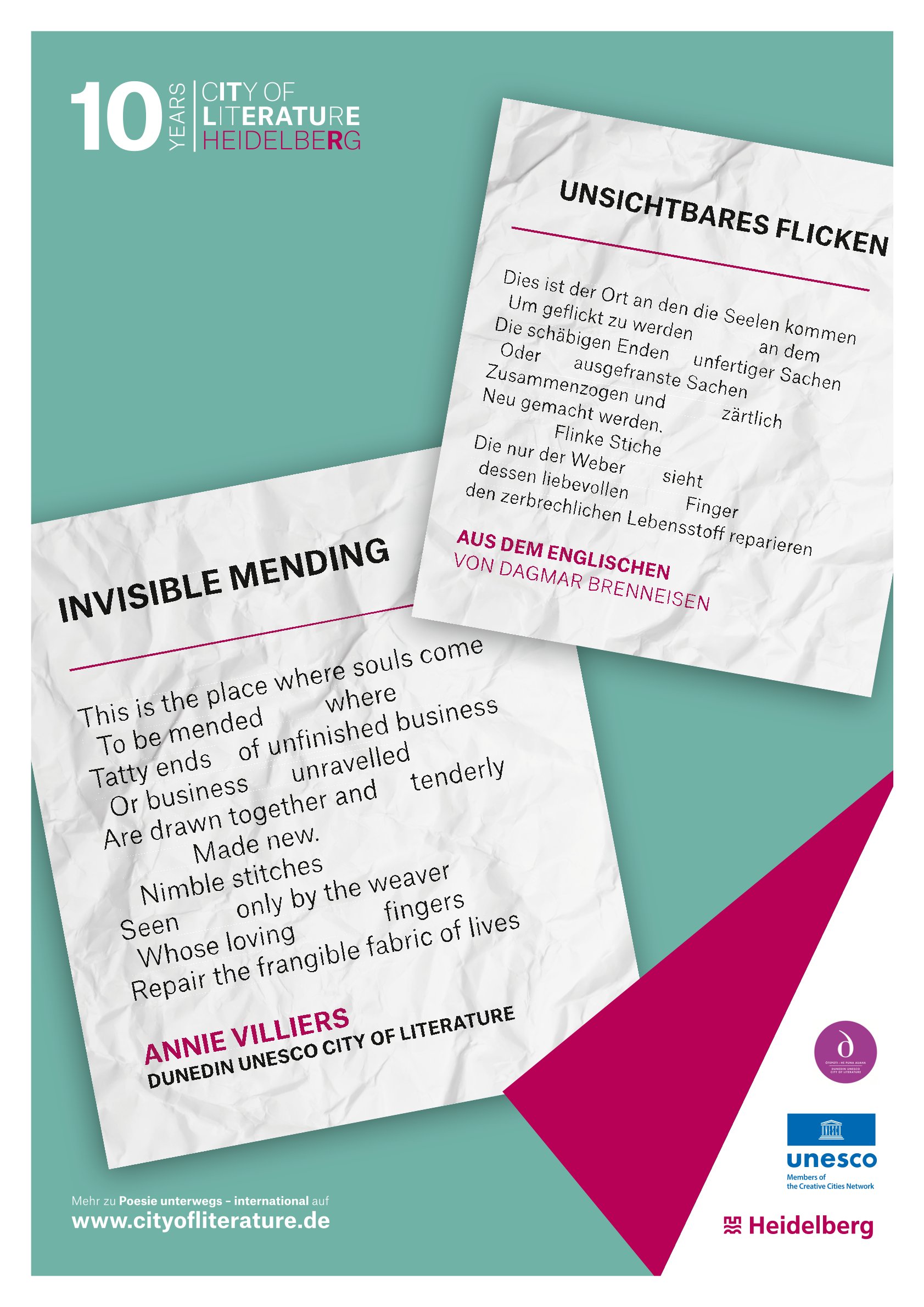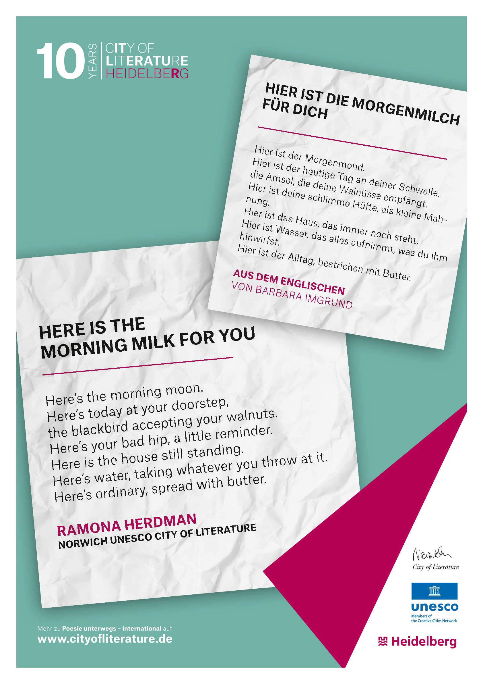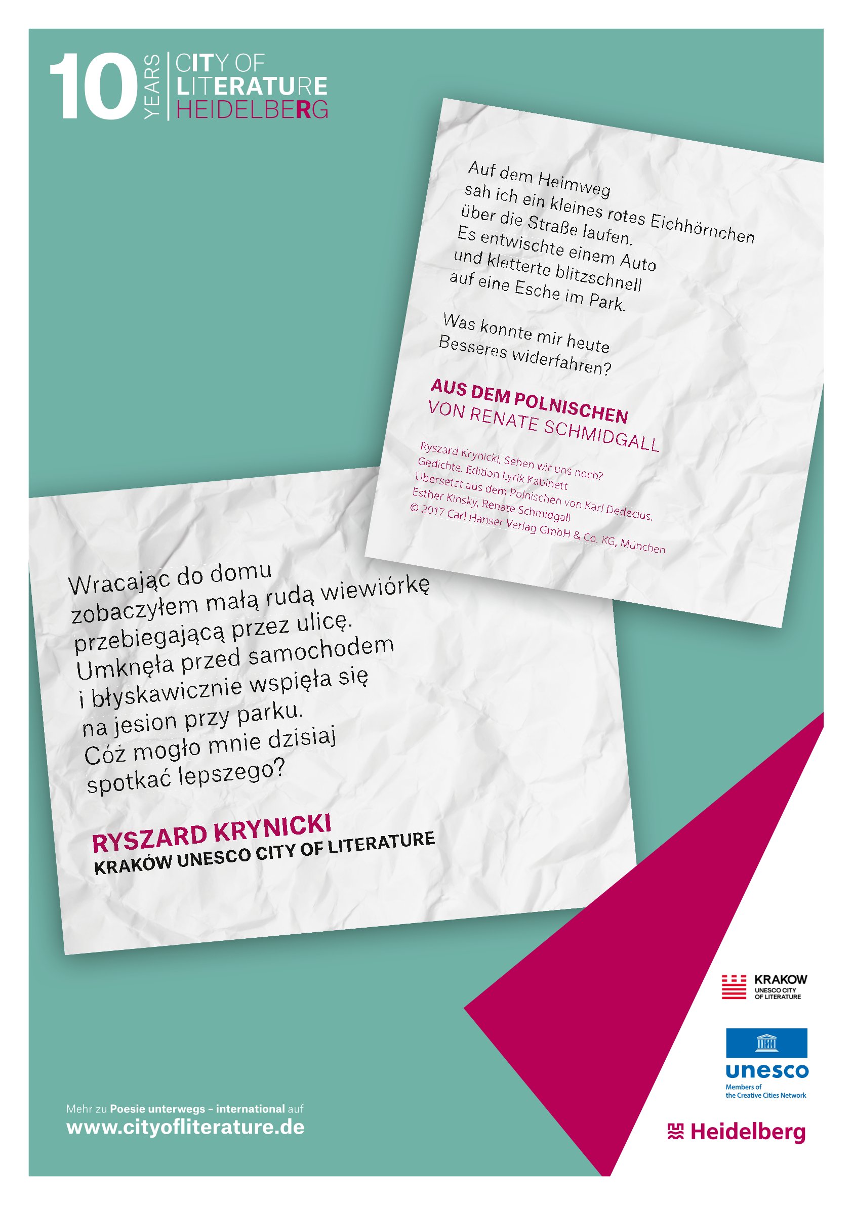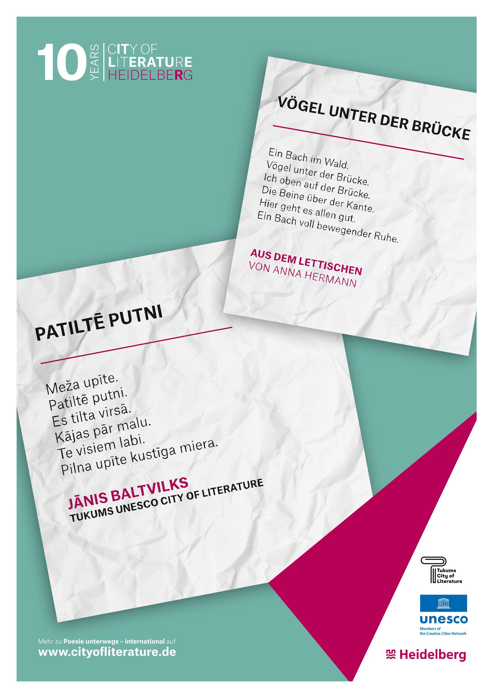 Im Dezember 2017 startete erstmals die ganzjährige Aktion "Poesie unterwegs". Seitdem sind vermehrt und wortwörtlich Gedichte und Gedanken von Heidelberger Autorinnen und Autoren in der UNESCO-Literaturstadt unterwegs, ob in Straßenbahnen der Rhein-Neckar-Verkehr GmbH (rnv) als Plakate an den Seitenscheiben oder in Form von Postkarten in den Aufstellern in Bars und Institutionen.