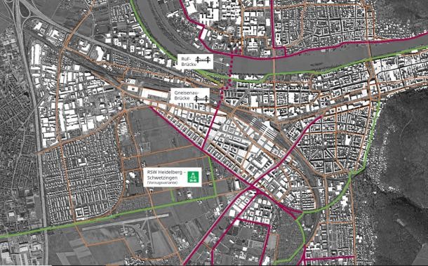 Sowohl am nördlichen Neckarufer wie auch in Bergheim-West werden die angrenzenden Freiräume weiterentwickelt – nicht nur zum Passieren, sondern auch zum Verweilen. Dies umfasst den Bereich zwischen den beiden zukünftigen Brücken an der Ochsenkopfwiese als auch den sog. Gneisenaupark zwischen B37 und Vangerowstraße.