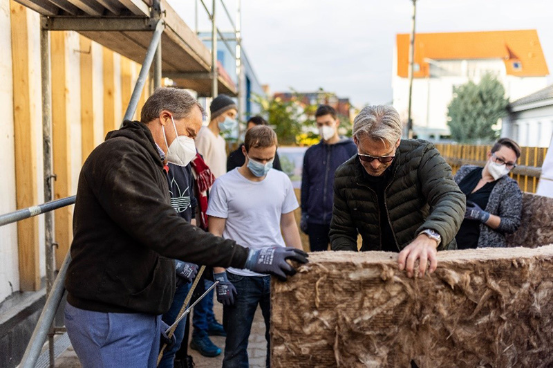 Beim Jugendklimagipfel des BUND im September hatten Oberbürgermeister Prof. Dr. Eckart Würzner und die jungen Teilnehmenden die Idee, mit einer gemeinsamen Aktion auf genau diese Herausforderungen aufmerksam zu machen. Bei der Firma Holzbau Damm in Wieblingen halfen Oberbürgermeister Prof. Würzner, zwei Teilnehmende des Jugendklimagipfels sowie Schülerinnen und Schüler der Johannes-Gutenberg-Schule bei der Dämmung einer Schreinerei-Halle mit. Darüber hinaus bekamen sie Einblicke in Dämmtechniken und Dämmstoffe.