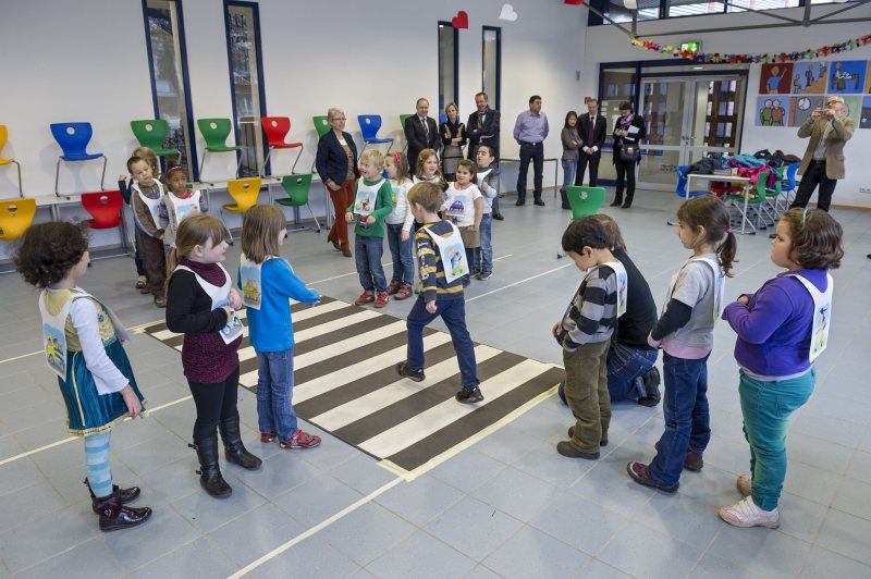 Mit dem vorab einstudierten „ADACUS-Song“ hatten die Erstklässler den Besuch vom ADAC und der Stadt begrüßt. Nach wenigen Erklärungen durch die Moderatorin konnte direkt die eigens aufgebaute, kleine Fußgängerampel und der Zebrastreifen in der Aula der Geschwister-Scholl-Schule „sicher“ überquert werden, während die als Auto oder Lkw verkleideten Mitschüler ihre „Fahrt“ immer wieder zugunsten der Fußgänger unterbrachen. Die Rektorin der Geschwister-Scholl-Schule, Sabine Horn, freute sich, dass „Aufgepasst mit ADACUS“ an ihrer Schule durchgeführt wurde: „Die Sicherheit unserer Erstklässler im Straßenverkehr ist uns ein wichtiges Anliegen. Die spielerische Herangehensweise des Programmes an dieses wichtige Thema finden wir sehr gelungen und ansprechend für unsere Schülerinnen und Schüler.“