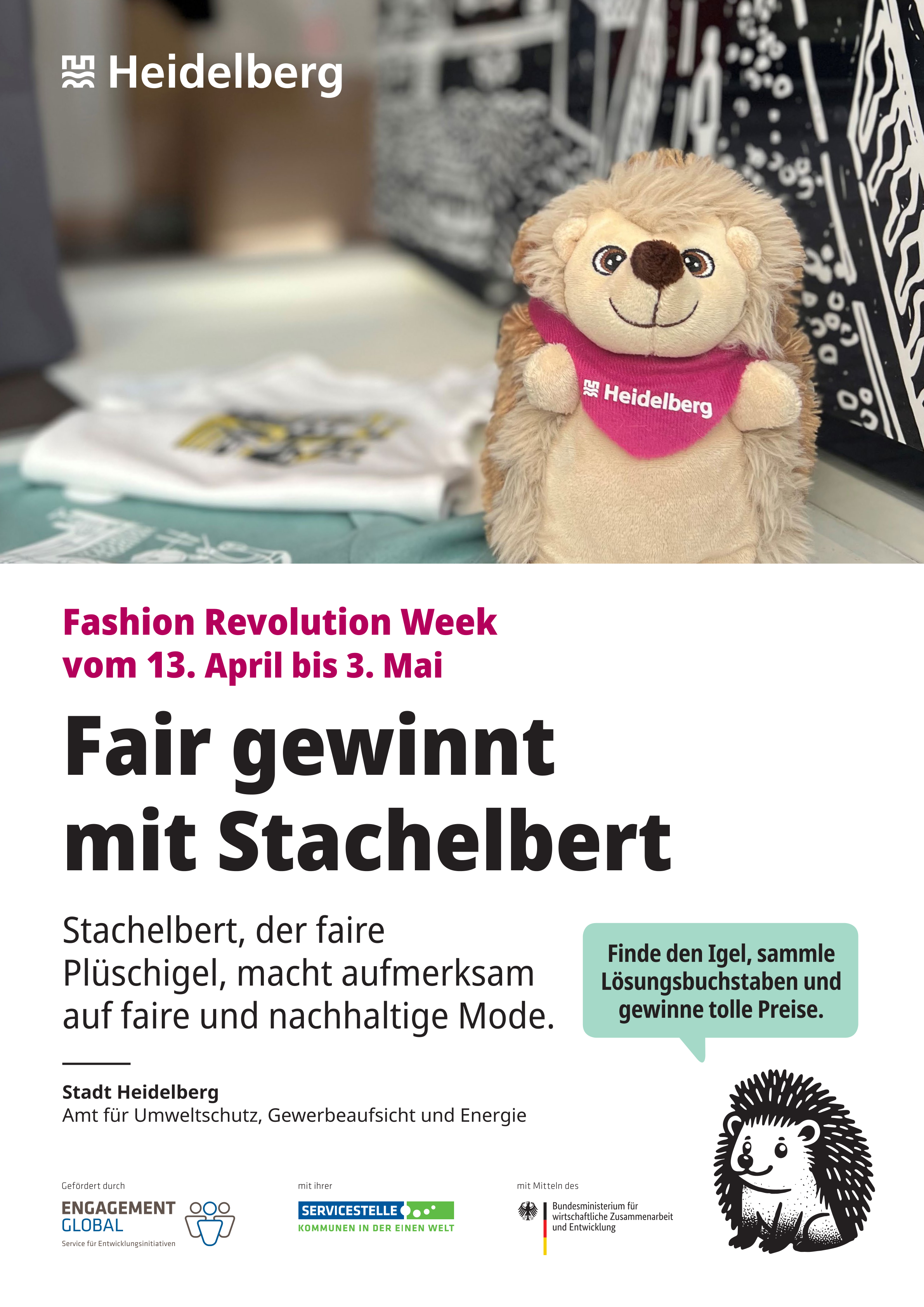Unter dem Motto „Fair entdecken – mit Stachelbert durch Heidelberg“ sind Orte der Nachhaltigkeit gesucht: Engagement für fairen Handel, nachhaltigen Konsum und globale Verantwortung.
