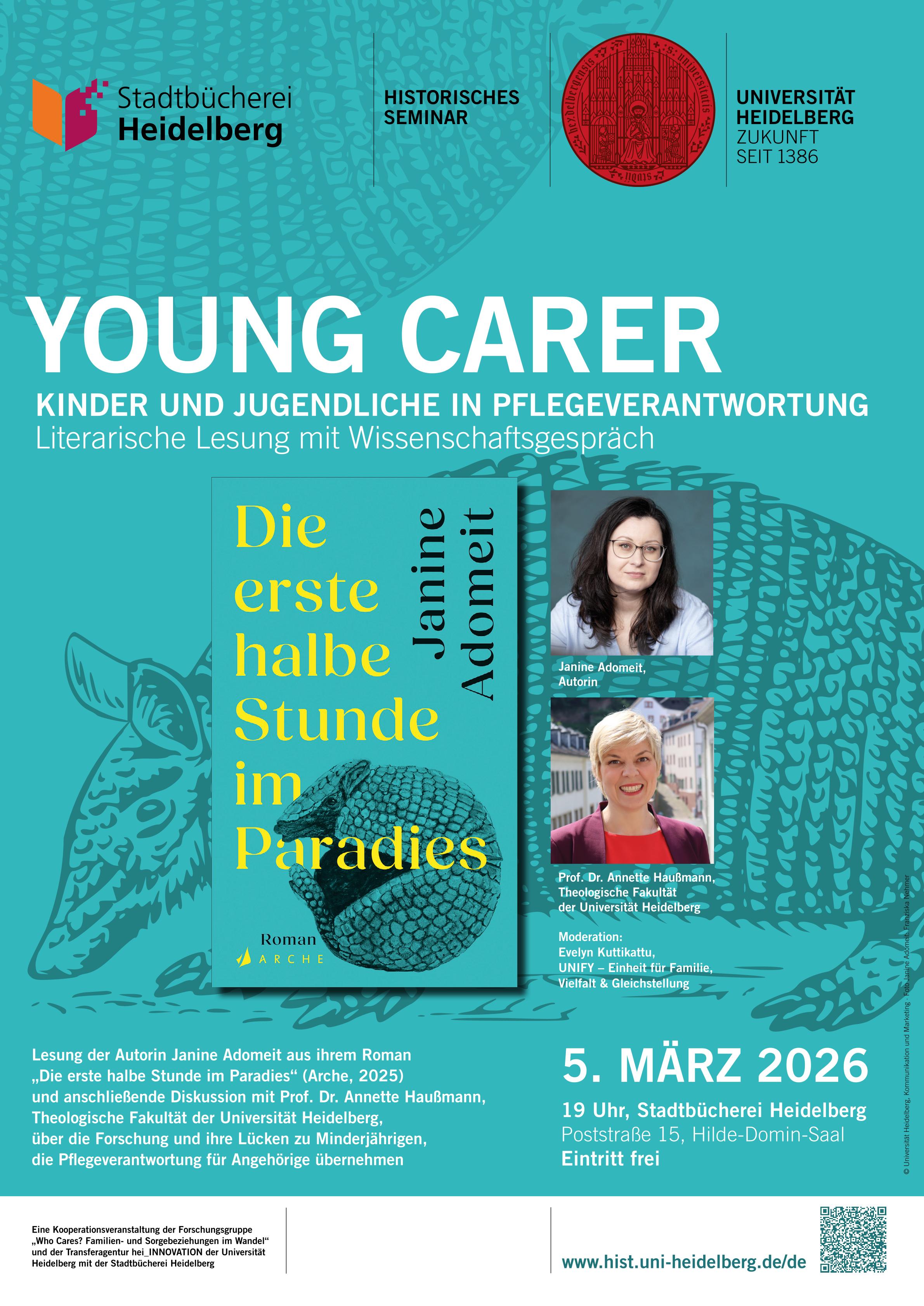 Am 05. März findet um 19 Uhr die Lesung (753 KB), organisiert durch die Forschungsgruppe „Who Cares? Familien- und Sorgebeziehungen im Wandel" zusammen mit der Transferagentur hei_INNOVATION der Universität Heidelberg und der Stadtbücherei Heidelberg, in der Stadtbücherei Heidelberg im Hilde-Domin-Saal statt.