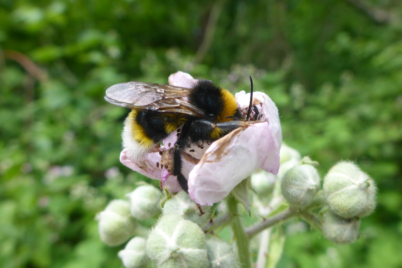 Auch die Hummel gehört zu den Wildbienen und ist eine der wenigen Wildbienen-Arten die einen Staat bilden. Jedoch überwintern nur die Königinnen. Hier sammelt eine Gartenhummel (Bombus hortorum) Nektar und Pollen an einer Brombeerblüte. (Foto: Panienka) -