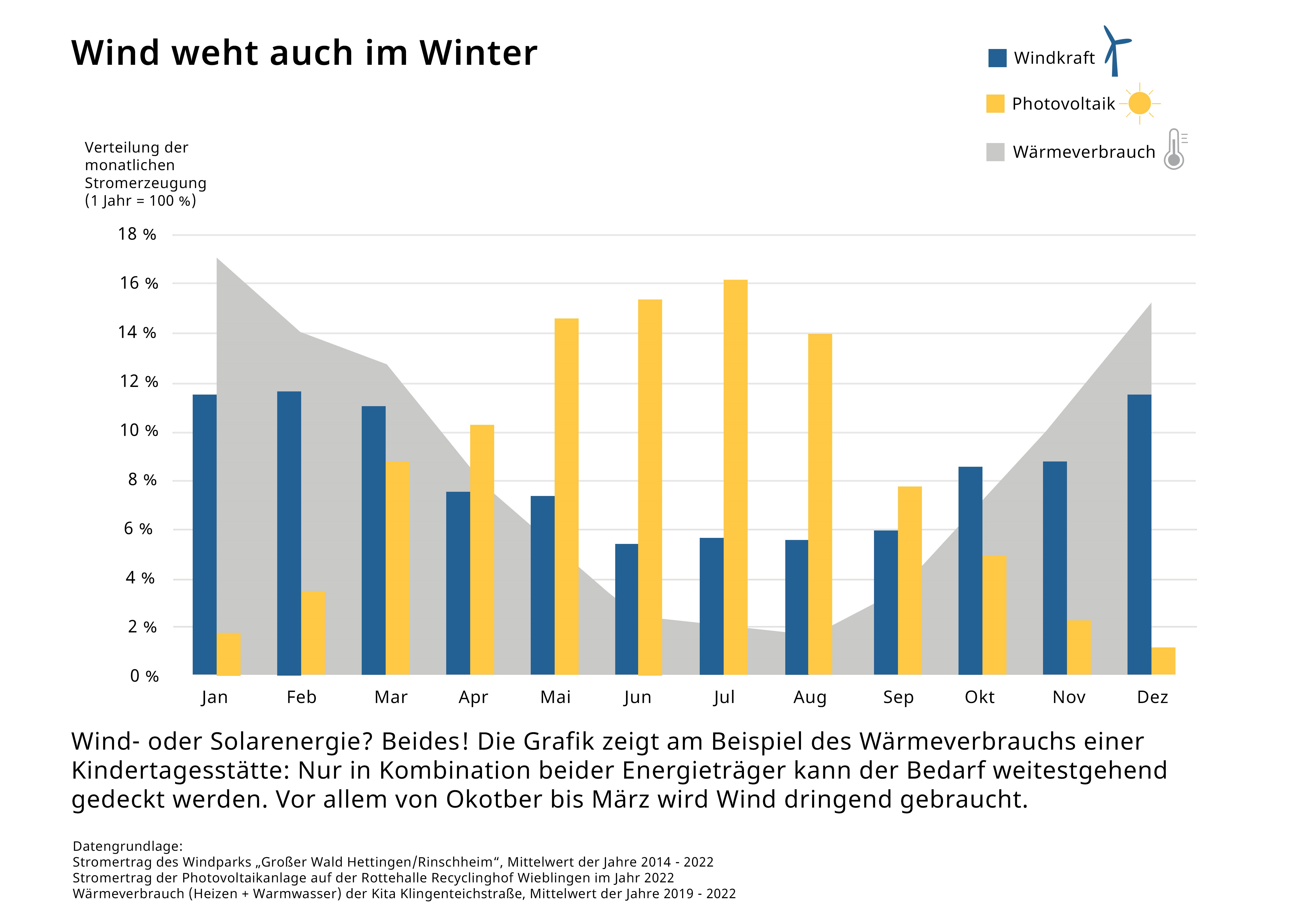 Während Photovoltaik-Anlangen besonders viel Strom im Sommerhalbjahr erzeugen, ist der Stromertrag von Windkraftanlagen gleichmäßiger über das Jahr verteilt mit einem Maximum im sonnenarmen Winterhalbjahr. Somit ergänzen sich Photovoltaik und Windkraft ideal.