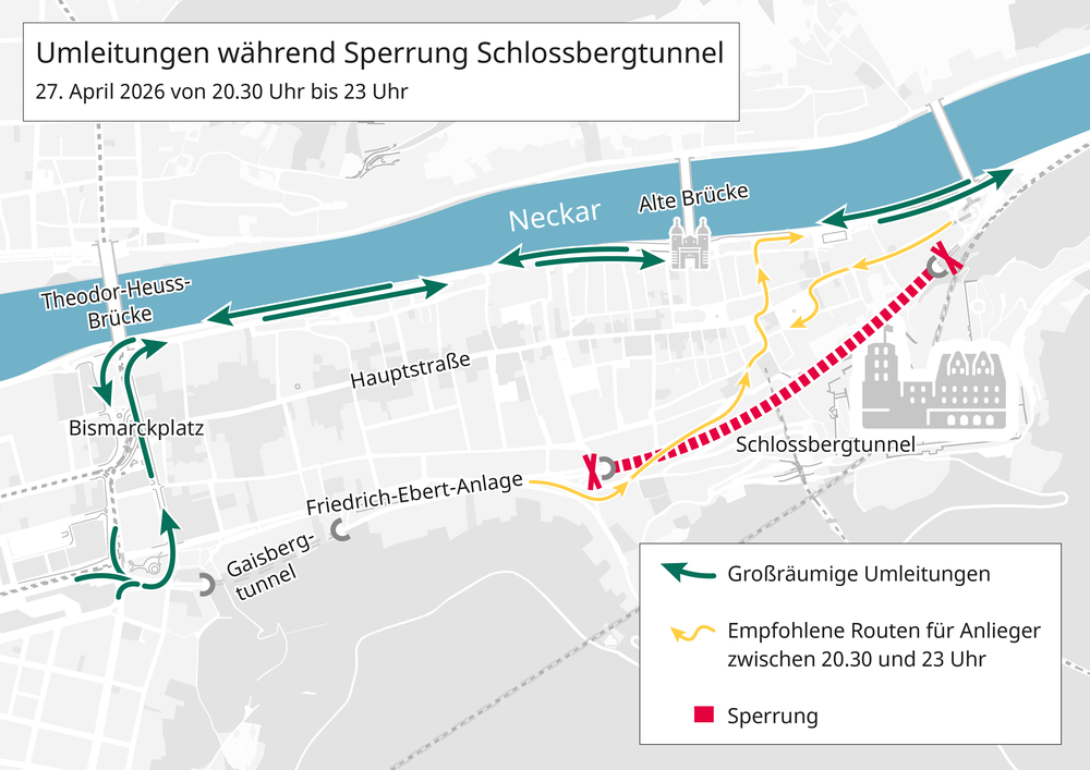 Für den Durchgangsverkehr empfiehlt die Stadt eine großräumige Umfahrung entlang der B 37 (Neckarstaden). Für Bewohnerinnen, Bewohner und sonstige Anliegende mit Ziel Altstadt empfiehlt die Stadt während der Sperrung des Schlossbergtunnels am 27. April zwischen 20.30 und 23 Uhr folgende Routen: