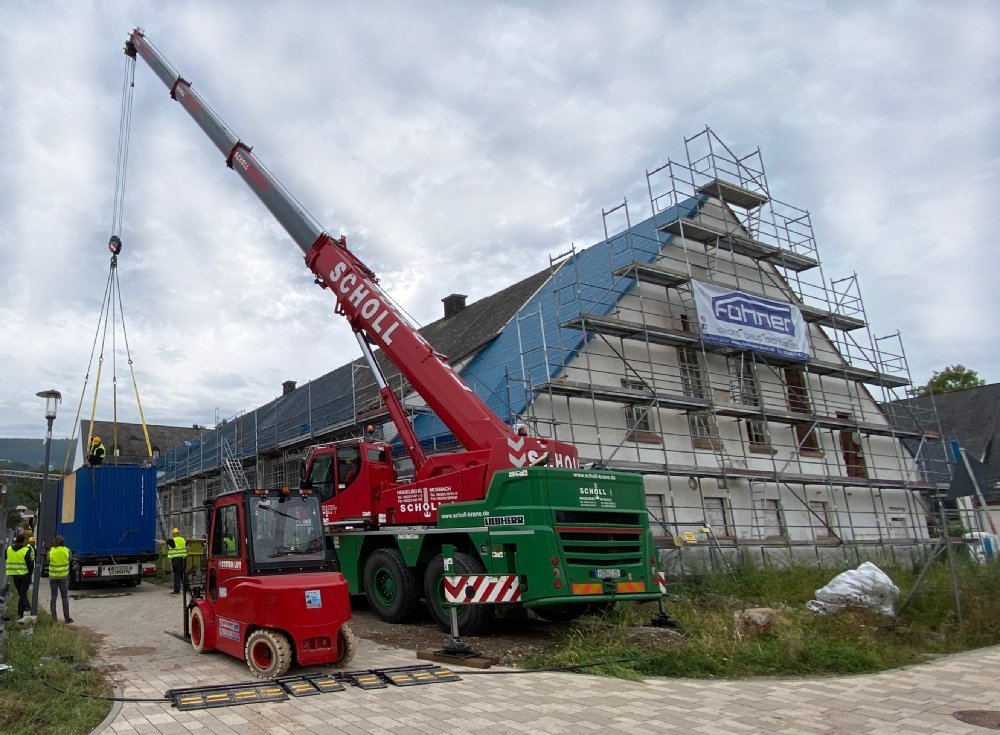 Auf der Baustelle der neuen Beachhalle geht es mit großen Schritten voran: Acht ehemalige Schiffscontainer sind nun eingetroffen, die eine flexible und nachhaltige Raumlösung bieten. Die am Bodensee eigens umgebauten Schiffscontainer mit Maßen von sechs Metern Länge, zwei Metern Breite und 2,60 Metern Höhe bringen jeweils rund 2.400 Kilogramm auf die Waage. Die Containerlösung ist flexibel, kosteneffizient und schnell einsetzbar. Zudem ermöglicht sie es, das denkmalgeschützte Hauptgebäude weitgehend unberührt zu lassen. So bleibt die historische Substanz erhalten, während gleichzeitig moderne Nutzungsanforderungen erfüllt werden. Bei den Seecontainern handelt es sich um recycelte One-Way-Container, die in der Regel nach einmaliger Transportnutzung entsorgt oder weiterverkauft werden.