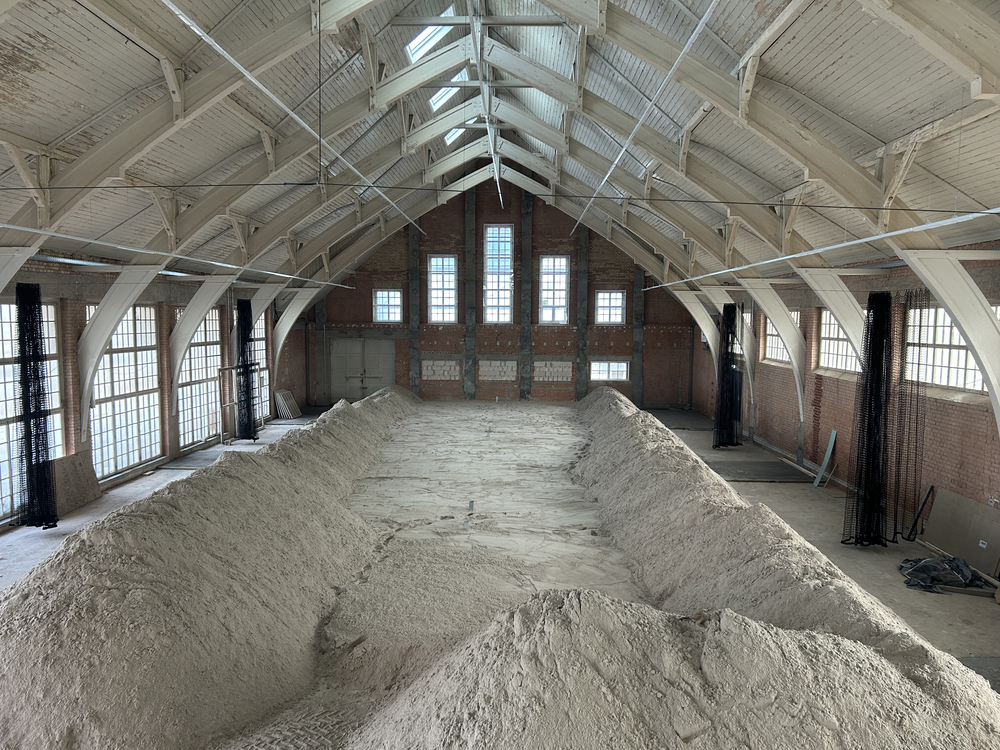 Nachdem der Sand ins Gebäude gebracht und auf den Flächen verteilt wurde, kann die Öffnung in der Außenwand – die zuvor auch für den Transport der Container in die Nebenräume genutzt wurde – wieder geschlossen werden. Hier wird eine neue doppelflügelige Portaltür eingebaut, die in Zukunft den Haupteingang in die Halle darstellen wird. Über der Tür wird ein zuvor ausgebautes und über die Bauzeit eingelagertes, unter Denkmalschutz stehendes Oberlicht wieder eingebaut. Des Weiteren werden die historischen, nicht ballwurfsicheren Fenster mit einer Schutzkonstruktion aus großflächigen Makrolonscheiben ausgestattet.