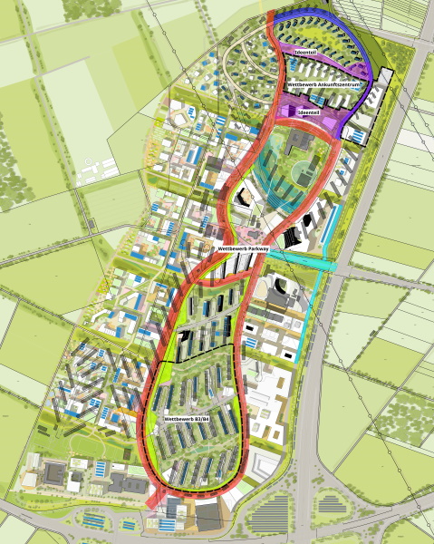 Parkway angrenzende Flächen. Die Registrierungs-und Verwaltungseinheit wird im östlichen Bereich zwischen dem Parkway und der Autobahn entstehen. Die Unterkunft für die Menschen auf der Flucht wird auf der zentralen Fläche zwischen den Offiziersvillen und dem künftigen Stadtteil-Zentrum untergebracht werden. Der Planungswettbewerb soll daher besonders auf kurze Wegeverbindungen zwischen den beiden Einrichtungsteilen achten. Zudem sollen gute Wegeverbindungen von den angrenzenden Quartieren um das Ankunftszentrum herum und in Richtung Zentrum mitgedacht werden. Weiterhin sollen die Planungsbüros eine gemeinsame Nutzung und nachhaltige Gestaltung der Freizeitflächen und eine weitgehende Integration des Baumbestandes berücksichtigen.
