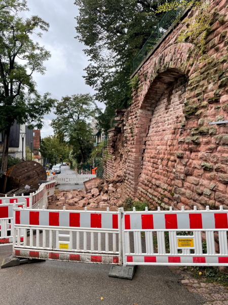 Am Dienstagmorgen, 27. September 2022, ist in der Albert-Ueberle-Straße im Stadtteil Neuenheim gegenüber Hausnummer 20 ein Teil der bergseitigen Stützmauer eingestürzt. Als Sofortmaßnahme wurde die Albert-Ueberle-Straße in dem Bereich voll gesperrt. Die Vollsperrung bleibt bis zur Klärung der weiteren Vorgehensweise sicherheitshalber bestehen. Des Weiteren wurde zusätzlich die Treppenanlage zwischen den Hausnummern 19 und 21 gesperrt. Die Albert-Ueberle-Straße ist von beiden Seiten bis zur Absperrung anfahrbar, jedoch ohne Wendemöglichkeit.