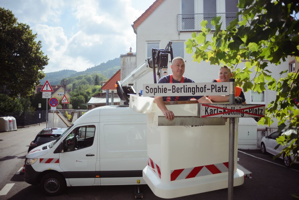 Zum 1. August 2025 erhalten sechs Heidelberger Straßen und ein Platz einen neuen Namen. Die Stadt Heidelberg hat die neuen Straßenschilder am Dienstag, 29. Juli 2025, befestigt. Die bestehenden Schilder bleiben noch rund zwei Jahre an Ort und Stelle, die früheren Straßennamen sind nun durchgestrichen.