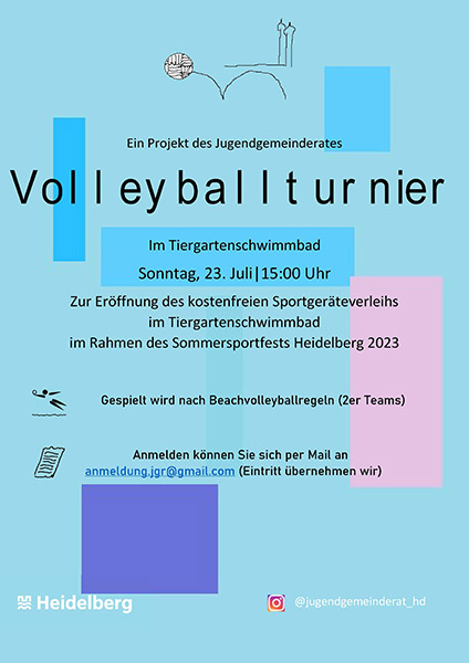 Der Jugendgemeinderat veranstaltet am 23. Juli um 15 Uhr im Rahmen des Sommersportfestes Heidelberg ein Volleyballturnier im Tiergartenschwimmbad Heidelberg,Tiergartenstraße 13, 69121 Heidelberg. Anmeldung unter E-Mail: anmeldung.jgr@gmail.com (Eintritt übernimmt der Jugendgemeinderat).