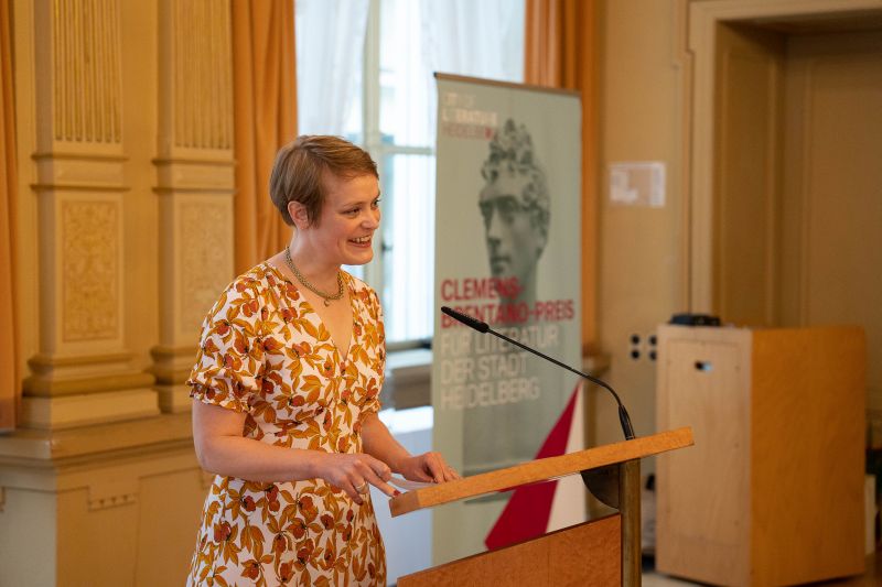 Preisträgerin Hanna Engelmeier verwies in ihrer Dankesrede (137 KB) darauf, dass die Gedichte Brentanos – unter anderem das von ihr oft gemurmelte „Wiegenlied“ – schon während des Schreibens eine Spur nach Heidelberg gelegt hatten: „Dass ich nur dem Murmeln nachgehen musste, um hierherzukommen, hat es mir leicht gemacht. Während ich ‚Trost. Vier Übungen‘ schrieb, hatte ich oft den Eindruck, mein Umgang mit den teils schwergewichtigen Quellen des Buches gliche der Arbeit des verhältnismäßig kleinen Baggers, der im März 2021 die Aufgabe hatte, das monumentale Frachtschiff ‚Ever Given‘ auszubuddeln, das sich im Suezkanal verkeilt hatte. Gegen das Gefühl des läppischen Buddelns hilft letztendlich auch kein Brentano-Preis, wobei der schon sehr gut dafür ist, daran zu glauben, dass zumindest den Leserinnen und Lesern in der Jury eingeleuchtet hat, was ich geschrieben habe. Was für eine Freude!“