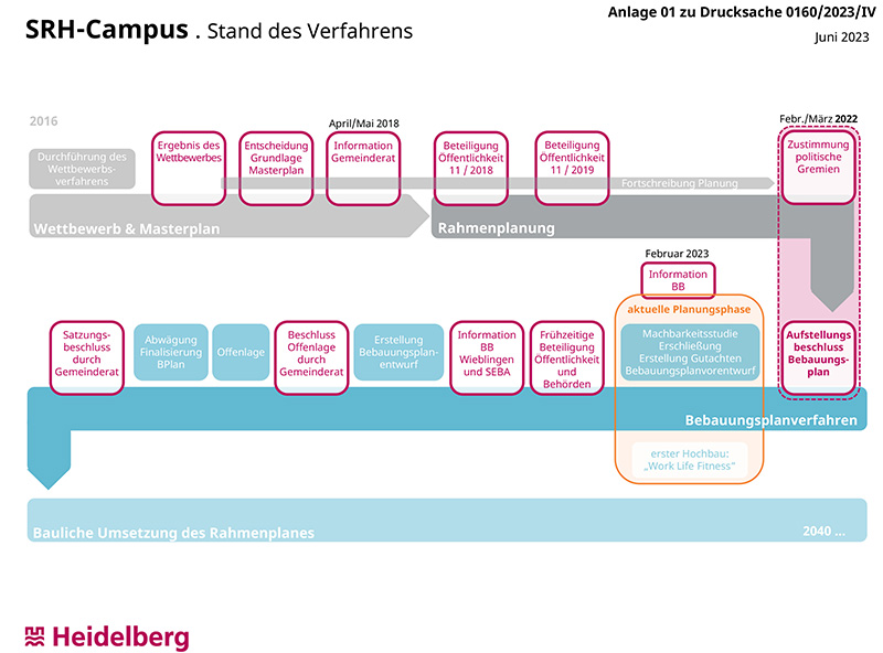 Die Entwicklung des SRH Campus erfolgt über einen langen Zeitraum und erfordert - vor der baulichen Umsetzung - verschiedene Planungsschritte, die in folgender Grafik dargestellt sind.