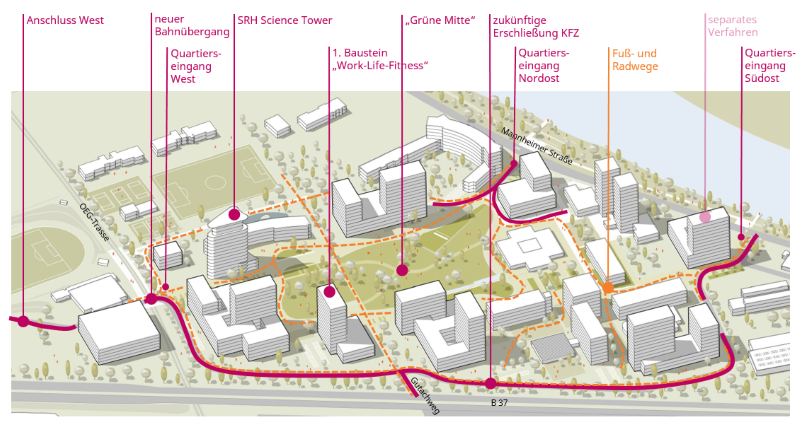 Die Erschließung soll zukünftig über eine neue, im Süden des Gebietes parallel zur B 37 verlaufende Straße erfolgen. Angebunden wird diese Straße im Osten über einen neuen Quartierseingang an der Mannheimer Straße. Im Westen quert die neue Erschließung die OEG-Trasse in Verlängerung der Ludwig-Guttmann-Straße und kann dadurch an das bestehende Verkehrsnetz im Bereich des Kurpfalzrings anbinden. Die bestehende Haltestelle „SRH Campus“ soll an diese neue Querung verlegt werden. Die bestehende Campuszufahrt auf Höhe der Ludwig-Guttmann-Straße bleibt als Stich zur Erschließung der nördlichen Gebäude erhalten. Ansonsten wird das bestehende Straßennetz weitgehend zurückgebaut. Neue Parkgaragen im Bereich der Campuseingänge fangen den motorisierten Individualverkehr an den Rändern ab.