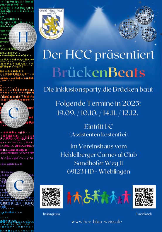 Die letzte Inklusionsparty in diesem Jahr findet am 12. Dezember im Vereinshaus des HCC im Sandhofer Weg 11, 69123 Heidelberg-Wieblingen von 19 bis 22 Uhr statt. Der Einlass beginnt um 18.30 Uhr