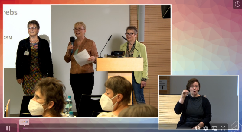 Im Rahmen der NCT-Veranstaltung „Rudern gegen Krebs“ fand ein Informationstag der Selbsthilfegruppe „Bewegte Frauen“ für krebserkrankte Frauen statt. Dabei war die KBB Kooperationspartnerin. Der Einsatz von Gebärdensprachdolmetscherinnen wurde auf ihre Initiative und durch sie finanziert hin bei der Veranstaltung angeboten. Die gesamte Veranstaltung ist dauerhaft online https://survivors-home.de/veranstaltung/patientenfortbildung-erkenntnisse-der-onkologischen-bewegungstherapie/ abrufbar, sodass auch Frauen mit Hörbehinderung an diese wichtigen Informationen gelangen können. Auch wurde die Methode der Taktilograpie, bei der blinde Frauen Tastuntersuchungen zur Früherkennung von Brustkrebs durchführen, auf ihre Anregung ins Programm genommen.