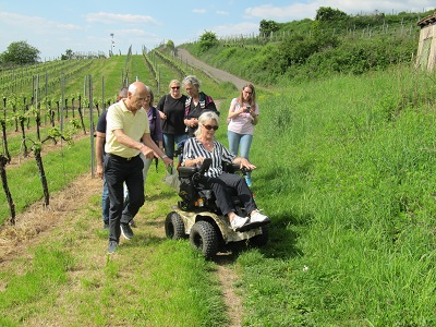 Während der Pilotphase im Sommer 2022 stand für verschiedene Aktionen der geländegängige Elektrorollstuhl Magic Mobility zur Verfügung. "Heute habe ich mich gar nicht behindert gefühlt!" so Kristina V. bei der geführten Weinbergwanderung.