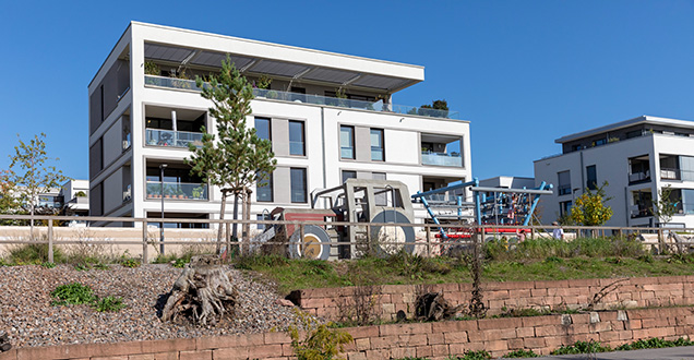 Man sieht ein Haus in der Bahnstadt. Und einen Spielplatz.