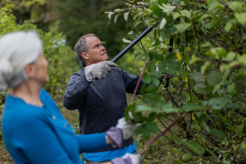 • Zwei Personen beim Baumschnitt mit großer Heckenschere