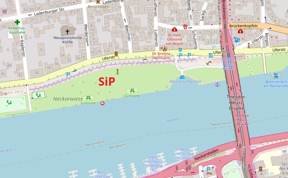 Adresse: Ecke Berliner Straße, Jahnstraße und Am Römerbad (bei Ernst-Walz-Brücke) in 69120 Heidelberg; Koordinaten 49.412101526496166, 8.677681306260164