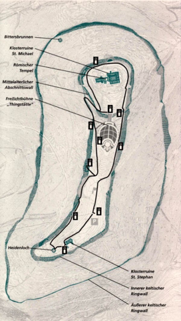 Der Heiligenberg ist nicht nur bedeutende Landmarke, sondern auch ein Kulturdenkmal ersten Ranges. Seine hervorragende natürliche Schutzlage mit einer überschaubaren, klar begrenzten Gipfelfläche sowie seine beherrschende Stellung in der Landschaft haben sehr früh Menschen angezogen und lassen bereits in der Bronzezeit eine größere Siedlung entstehen. Seit dem 5. Jahrhundert vor Christus spielte der Berg eine besondere Rolle in der wechselvollen Geschichte der Region. Zwei Klosterruinen und eine monumentale Freilichtbühne geben auf den ersten Blick nur die jüngsten Relikte seiner Jahrtausende währenden Besiedlungsgeschichte preis. Dagegen sind die beiden konzentrischen Umfassungswälle aus der Keltenzeit heute oberirdisch bestenfalls noch als steinübersäte Terrassenkanten zu erkennen. Die Befestigungsanlage besteht aus einem inneren Wall mit einem Umfang von 2,1 Kilometern und einem äußeren, deutlich tiefer gelegenen Wall von 3,1 Kilometern Umfang. Innerhalb der Ringwälle besetzten auf terrassierten Hängen Hunderte von Wohn- stellen und Gruben das Plateau und die Hänge.