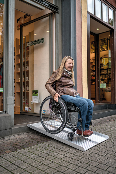 Mobile Rampen sind eine einfache und kostengünstige Möglichkeit, ein bis zwei Stufen mit dem Rollstuhl oder einem Kinderwagen zu überwinden. Der Preis für das Hilfsmittel liegt je nach Modell bei rund 100 bis 230 Euro. Von mobilen Rampen profitieren beide Seiten: Für mobilitätseingeschränkte Menschen eröffnen sich neue Möglichkeiten, und die Geschäftsleute gewinnen neue Kundschaft.