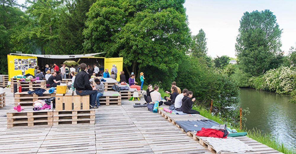 Menschen sitzen auf Holzpaletten am Flussufer.