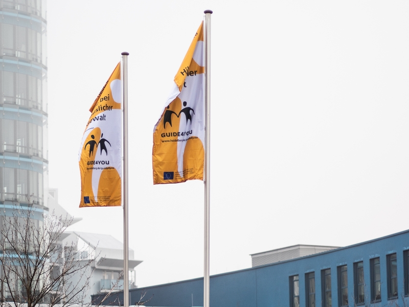 GUIDE4YOU flags were hoisted at the SRH University Heidelberg, the Center of Psychosocial Medicine of the Heidelberg University Hospital, the Ernst-Walz Bridge and in front of the City Hall at Kornmarkt during the Campaign week.