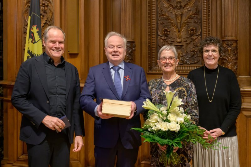 Prof. Dr. Peter-Christian Müller-Graff (2. v. l.) – mit Ehefrau Dr. Constanze Müller-Graff – erhielt von Regierungspräsidentin Sylvia M. Felder (r.) und Oberbürgermeister Eckart Würzner das Bundesverdienstkreuz 1. Klasse verliehen. (Foto: Philipp Rothe)