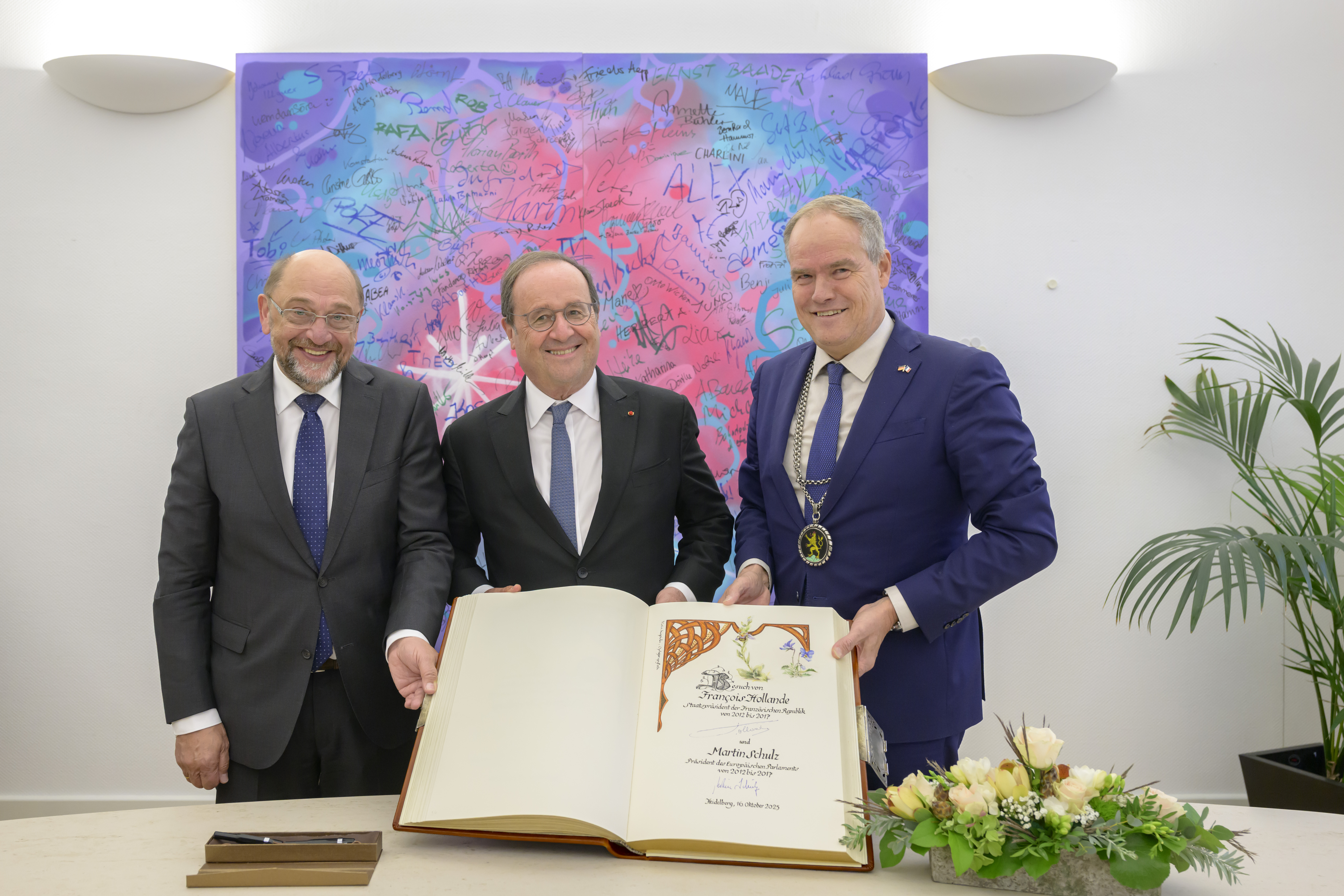 Der ehemalige französische Präsident François Hollande und Martin Schulz, ehemaliger Präsident des Europäischen Parlaments, haben sich am Donnerstagabend, 16. Oktober 2025, ins Goldene Buch der Stadt Heidelberg eingetragen. Der Eintrag erfolgte im Rahmen eines Besuches von Hollande und Schulz im Rathaus und eines gemeinsamen Treffens mit Heidelbergs Oberbürgermeister Eckart Würzner.
