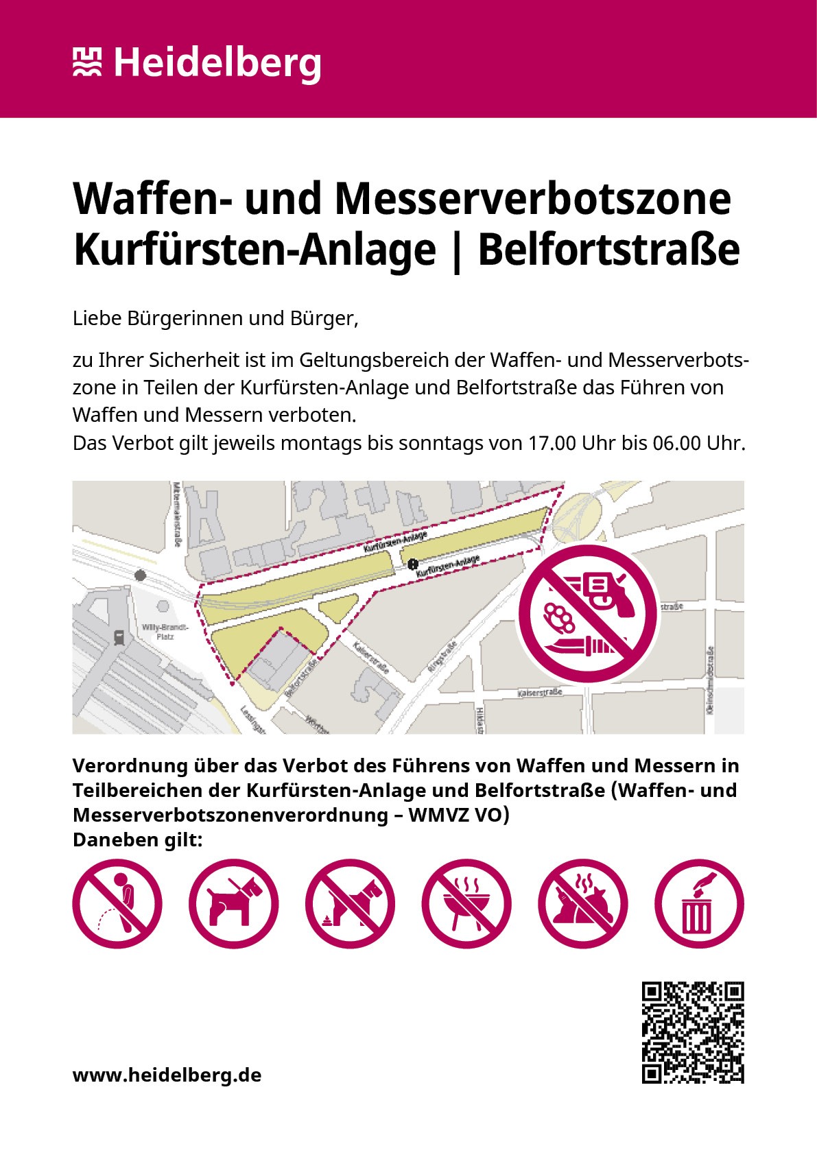Die Stadt Heidelberg hat die Aufgabe, die Öffentliche Sicherheit und Ordnung zu gewährleisten. Sie kann diese Sicherheit allerdings nur zusammen mit Politik, Gesellschaft und den Bürgerinnen und Bürgern in einer gemeinsam getragenen Verantwortung erfolgreich gestalten. Das setzt voraus: