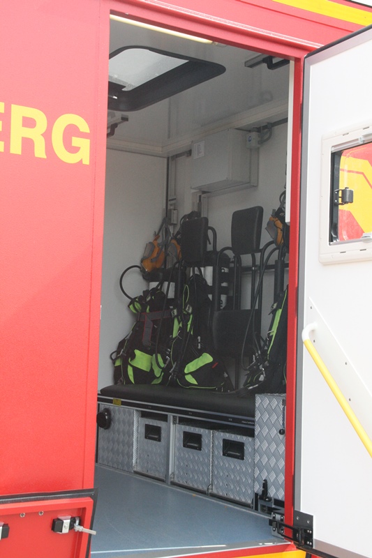 An der Einsatzstelle kann entlang des Aufbaus eine Markise als Wetterschutz ausgefahren werden. Breite, beim Öffnen der Mannschaftstür pneumatisch ausfahrende Tritte erleichtern den Ausstieg der Taucher.