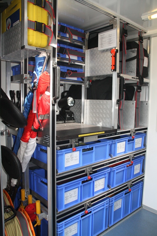Vervollständigt wird die Beladung um das Rettungsboot, welches vor Ausrücken an das Fahrzeug angehängt wird.