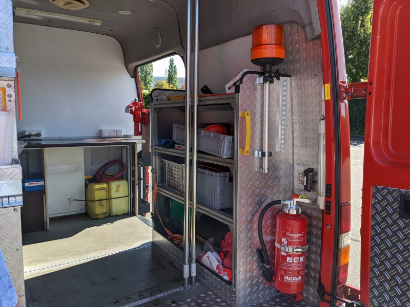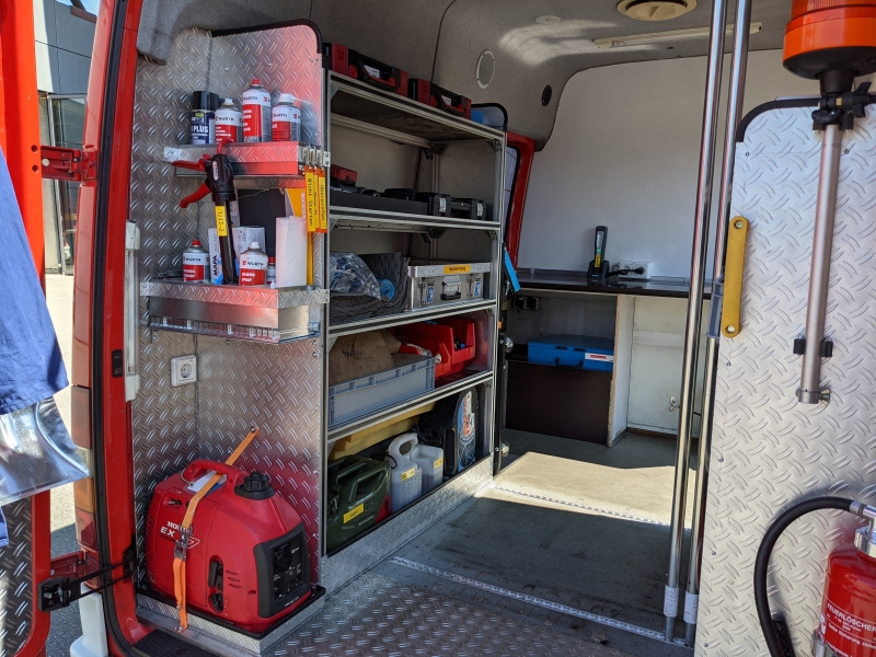 Die frühere Trennwand mit Regalen im Funk/-Arbeitsraum und an der Heckklappe wurde entfernt. An deren Stelle sind jetzt Regale an den Seitenwänden eingebaut worden. Dort sind verschiedene Werkzeuge, Schmiermittel, aber auch Kleinersatzteile wie Blinkerbirnchen gelagert. Ein kompakter Stromerzeuger ermöglicht den Betrieb von Geräten auch an abgelegen Stellen ohne lokalen Stromanschluss. Mitgeführte Auffahrschienen ermöglichen die Aufnahme von Standard-Rollcontainer der Feuerwehr.