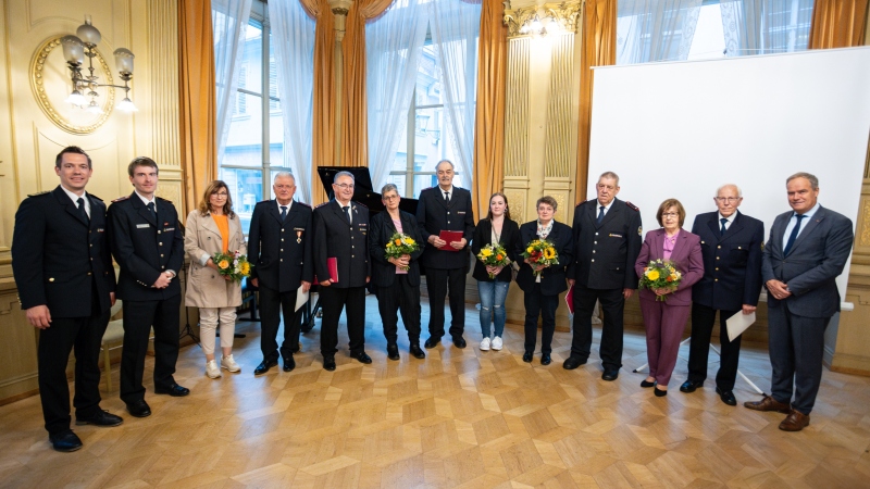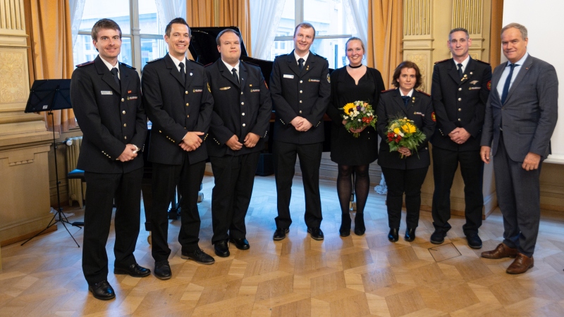 Für 25, 40 und 50-jährige Dienstzeit wurden sechs Feuerwehrangehörige ausgezeichnet. Weitere sieben Feuerwehrangehörige erhielten für ihre 50 und 60-jährige Zugehörigkeit zur Feuerwehr Heidelberg die Dankesurkunde der Stadt.