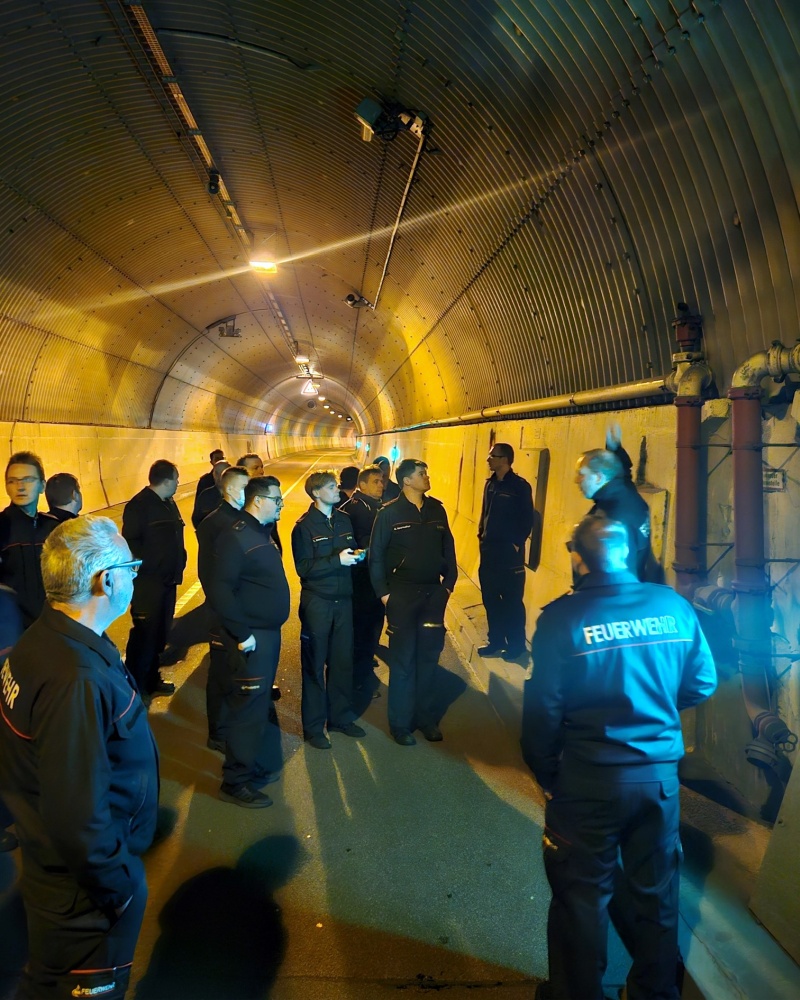 Am Montagabend hatten Führungskräfte der Freiwilligen Feuerwehr die Möglichkeit, den Tunnel und seine technische Ausstattung näher kennenzulernen: von der Tunnelleitzentrale, über die Löschwassereinspeisung, bis zum Fluchttunnel, dessen Türen bei Öffnung automatisch die Überdruckbelüftung aktivieren, um Brandrauch vom Fluchtweg fernzuhalten.