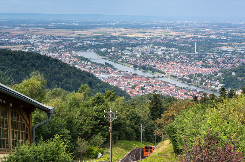 Vom Schloss oder vom Heidelberger Hausberg Königstuhl geht der Blick weit in die Oberrheinebene hinaus – an klaren Tagen bis hinüber zu den Pfälzer Bergen im Westen. Die ca. 30 Kilometer breite Rheinebene gehört zu den bedeutendsten tektonischen Grabensystemen der Erde. Der Einbruch des Oberrheingrabens begann vor mehr als 60 Millionen Jahren und dauert bis heute an, was sich in der Region durch zahlreiche schwächere Erdbeben bemerkbar macht.