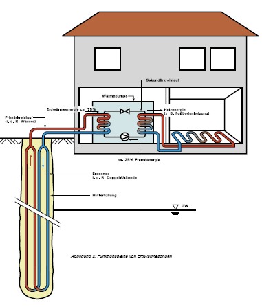Zur Nutzung von Erdwärme mit Erdwärmesonden werden vertikale Bohrungen mit Tiefen zwischen 50 und 200 m erstellt. In diese Bohrungen werden Doppel-U-Rohre, zum Beispiel aus HDPE-Kunststoff, eingebaut, in denen eine Wärmeträgerflüssigkeit zirkuliert. Die Flüssigkeit nimmt die Wärme aus dem Untergrund auf und leitet sie an eine Wärmepumpe weiter. In der Wärmepumpe wird mittels Wärmetauscher die Wärme in den Heizkreislauf des Wohngebäudes abgegeben.
