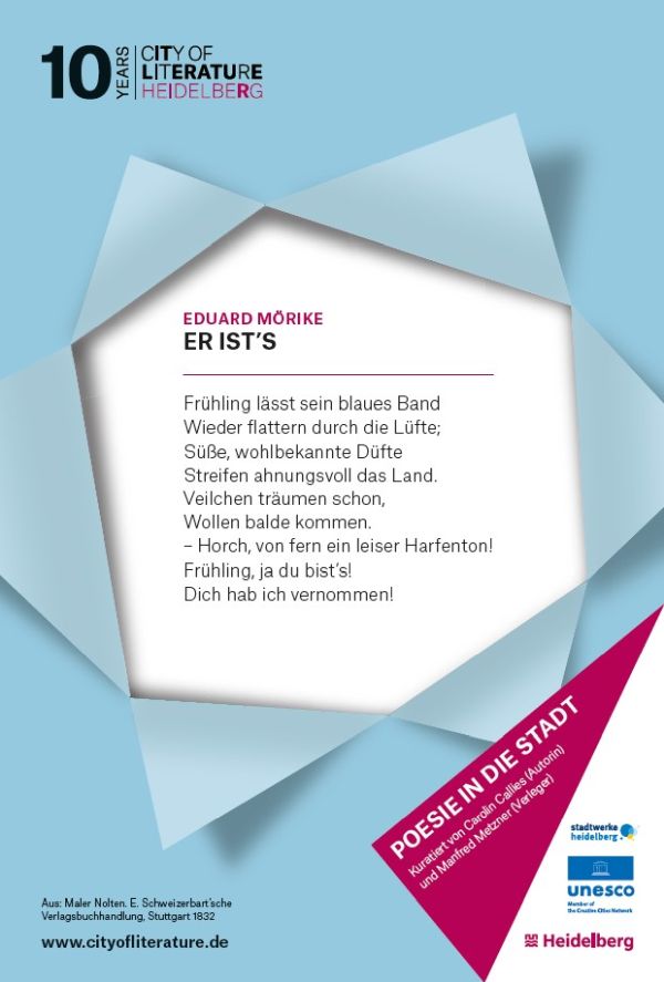 Kuratiert von der Ladenburger Lyrikerin und Literaturvermittlerin Carolin Callies sowie dem Heidelberger Verleger Manfred Metzner (Verlag Das Wunderhorn) sind 24 Gedichte aus verschiedenen Jahrhunderten und in deutscher Sprache repräsentativ verteilt in ganz Heidelberg zu sehen. Unter dem Namen „Poesie in die Stadt“ lädt die Plakatkampagne dazu ein, die Kurztexte – und dabei vielleicht ganz neue Ecken Heidelbergs – zu entdecken.
